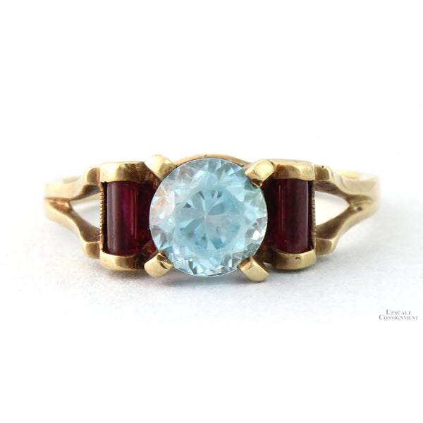 Art Deco Natural Blue Zircon & Created Ruby 10K Gold Ring