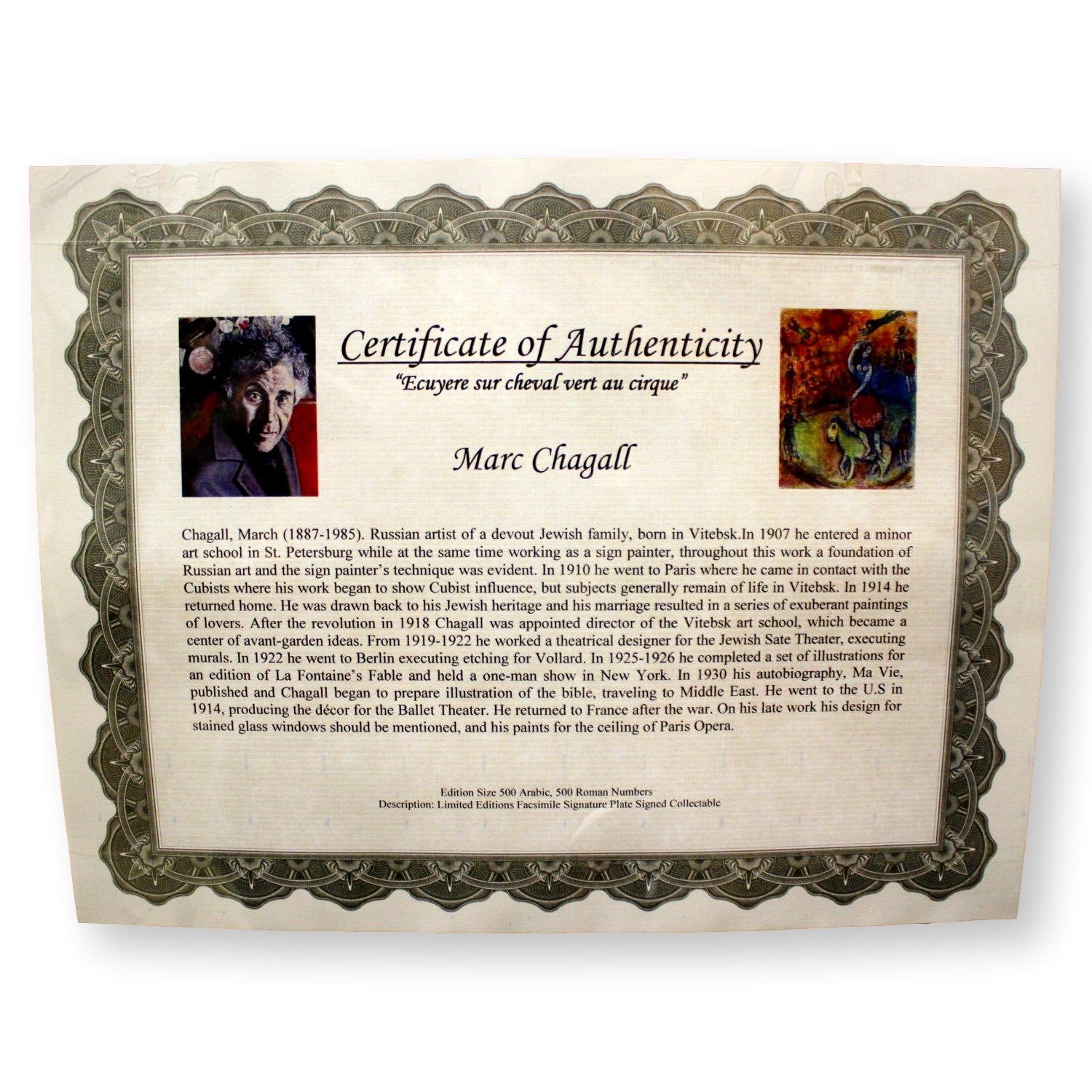 "Ecuyere sur cheval vert au cirque" depicts a colorful circus scene with acrobats and spectators, and features a black frame and artist bio. 58"(h) x 45"(w).