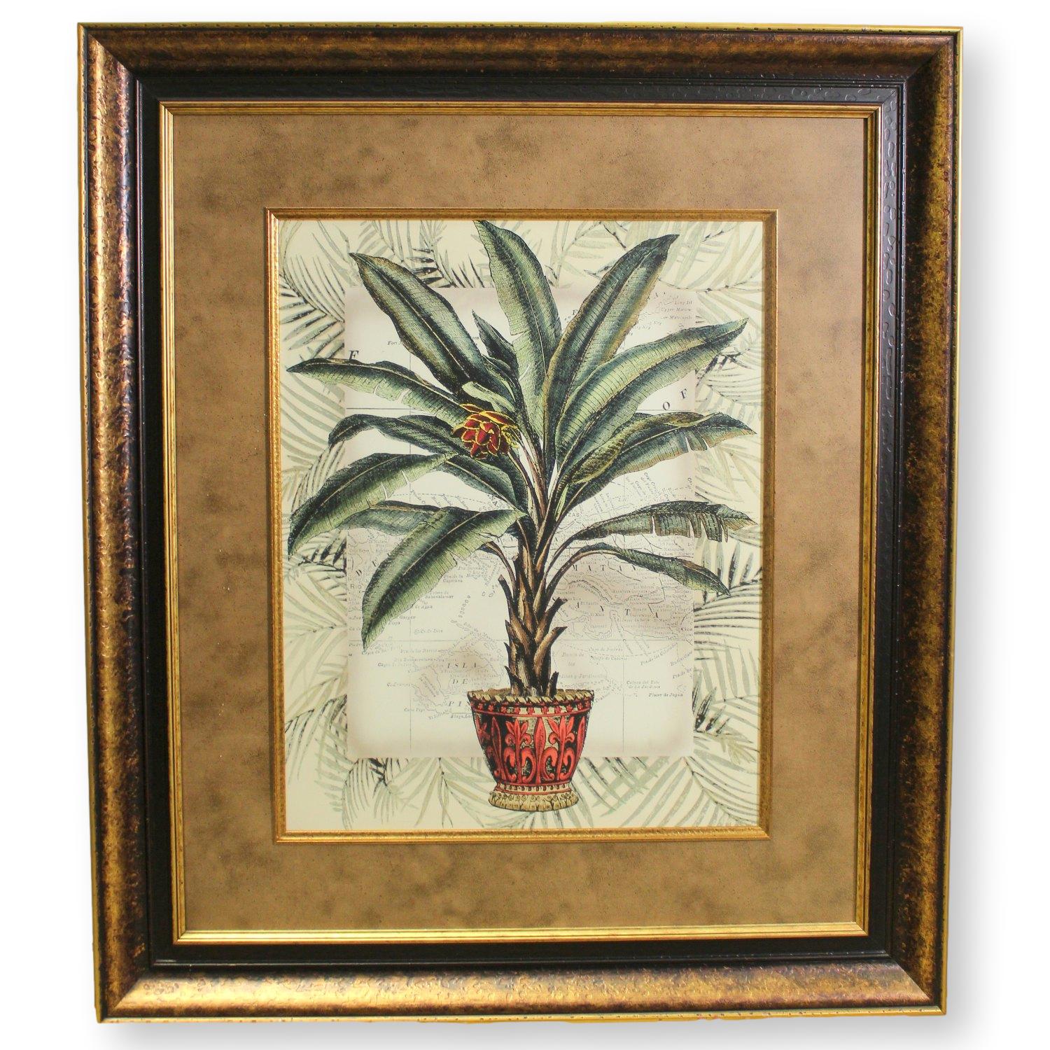 Botanical illustration featuring a tropical plant with broad green leaves and a single red bloom in a decorative red pot with black scrollwork. The background includes faint palm fronds and a vintage map motif with illegible script. Framed in an ornate surround with a gold inner border and textured brown outer edge, lending a classical and richly layered presentation.