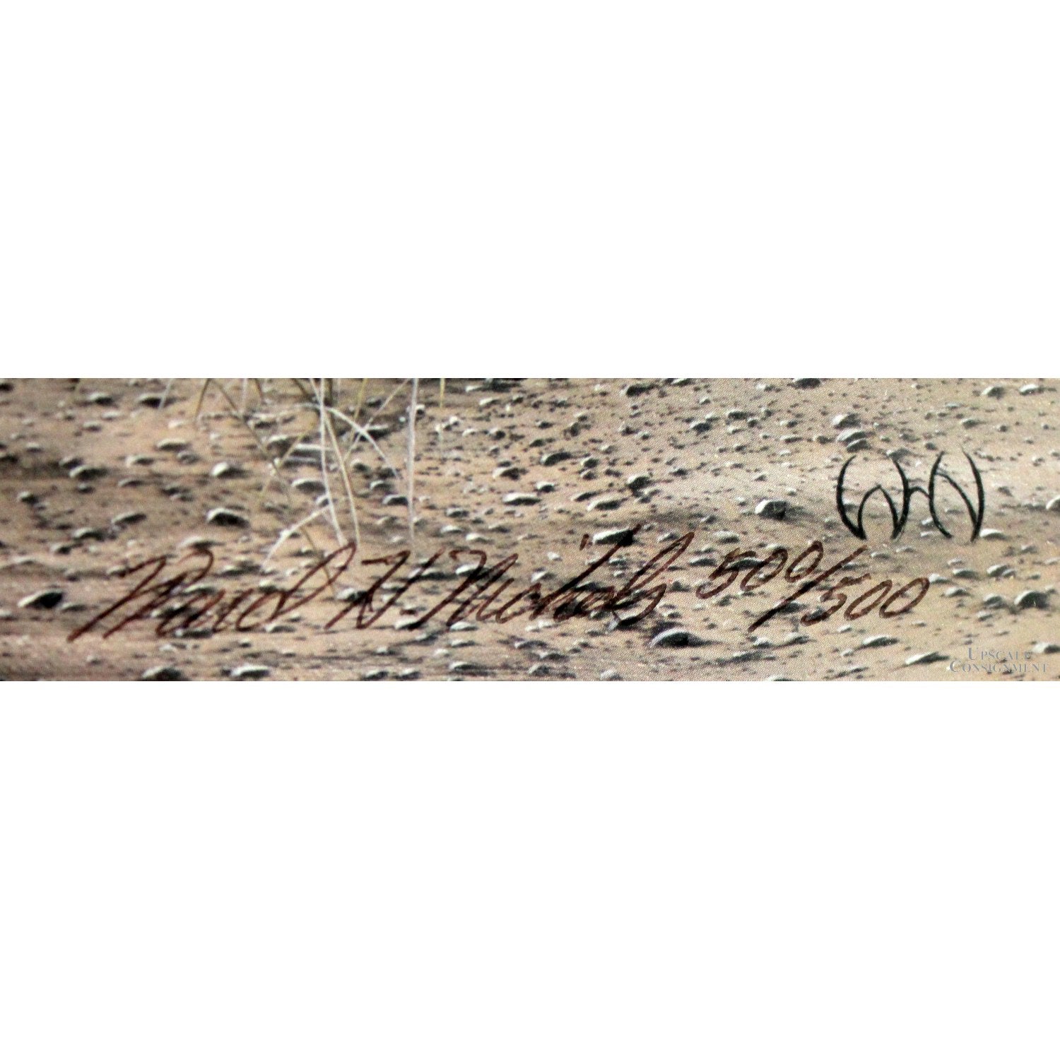 Limited edition print #500/500 depicting a weathered rural storefront in a leafless landscape, suggestive of late autumn or winter. Presented in a wooden frame with triple matting in beige, and two different muted brown tones. Includes artist information.