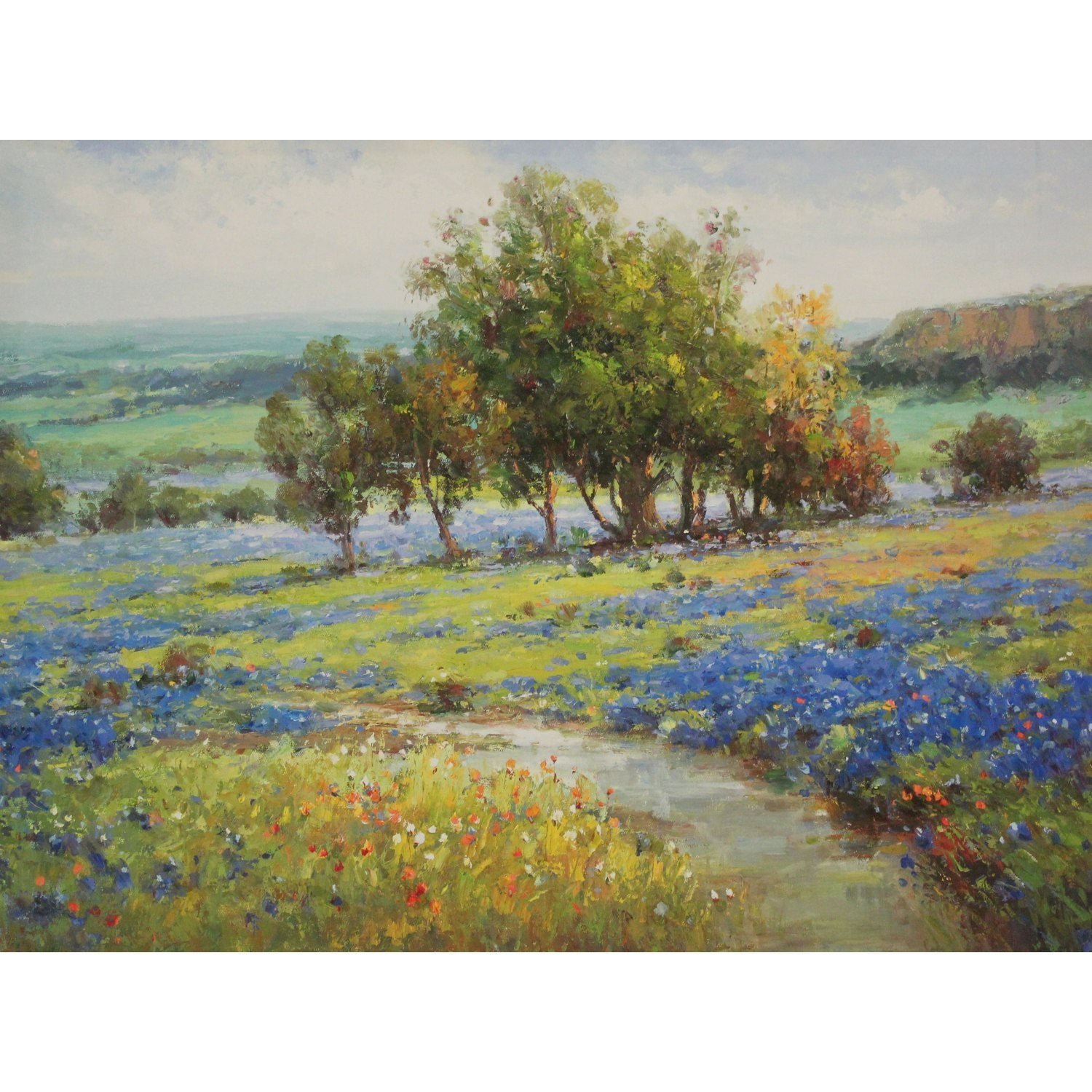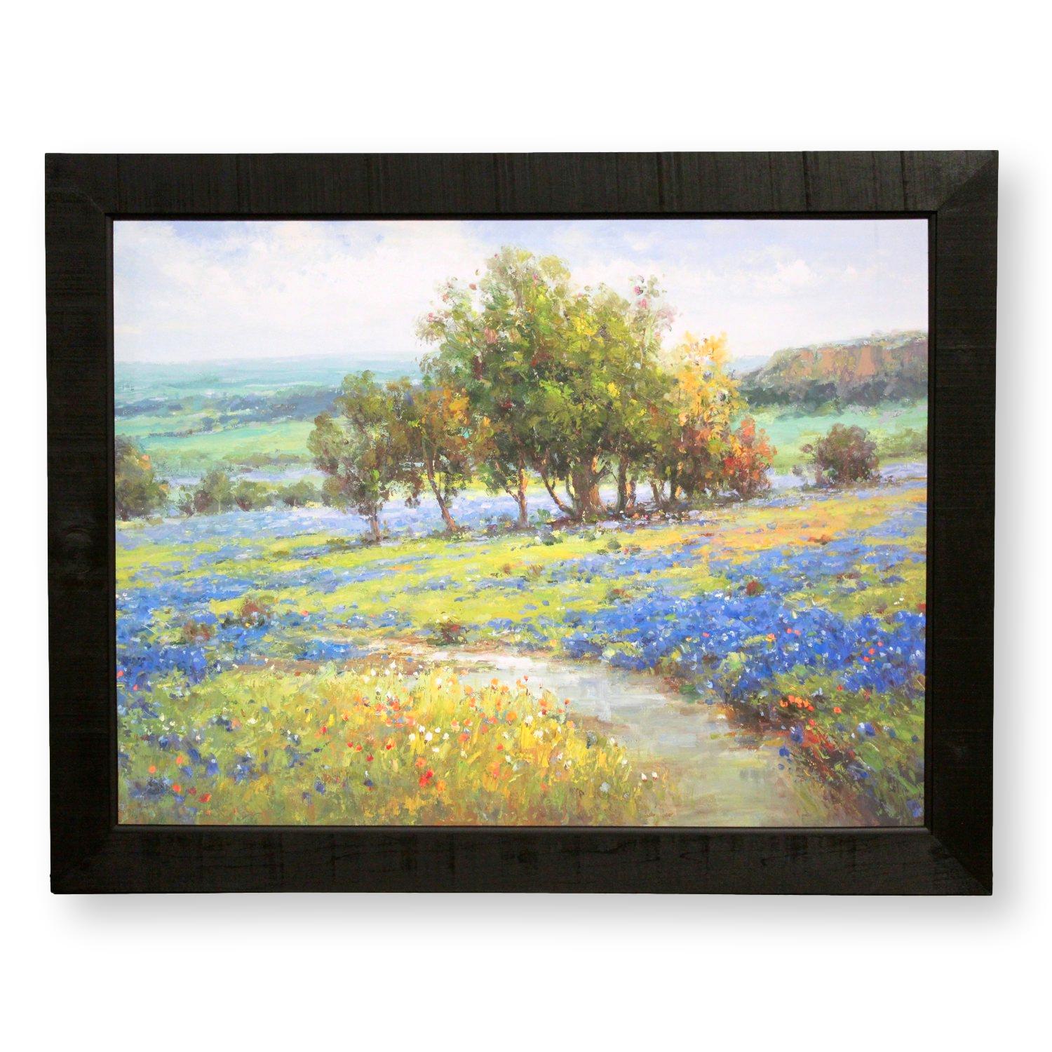 Features a wide black frame, and hand painted original oil of blue/purple flower fields with trees in the background.