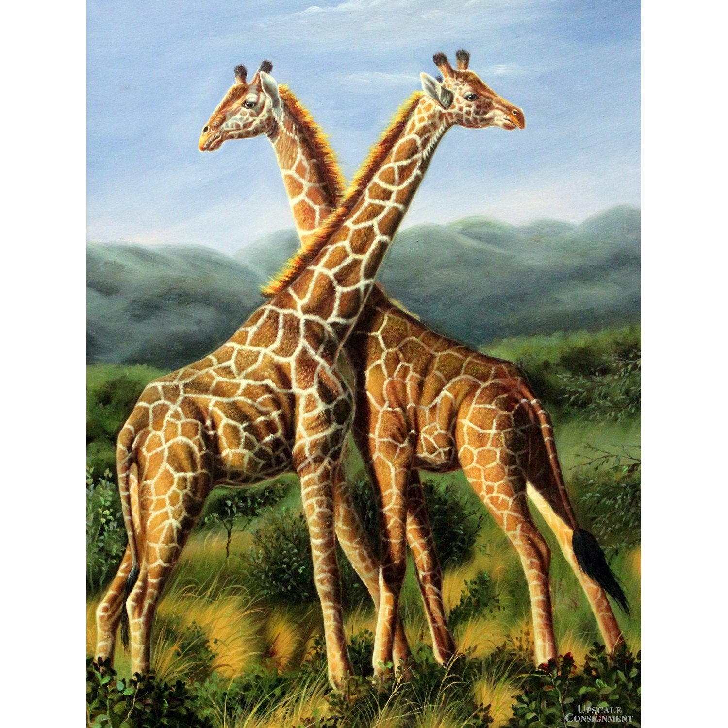 Features a mottled gold and red frame, and an original oil painting on canvas of 2 giraffes.