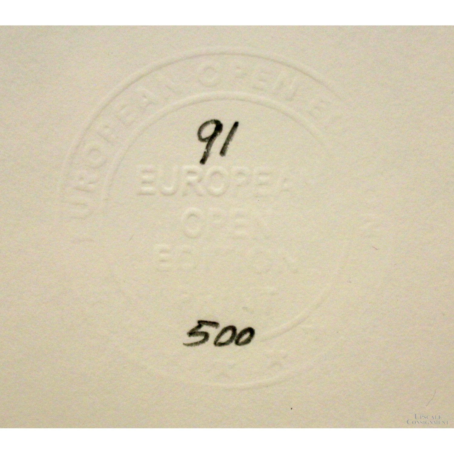 "Harlequin with Flowers" depicts a man & woman holding flowers, and features a black frame and artist bio. 59"(H) x 46"(w).