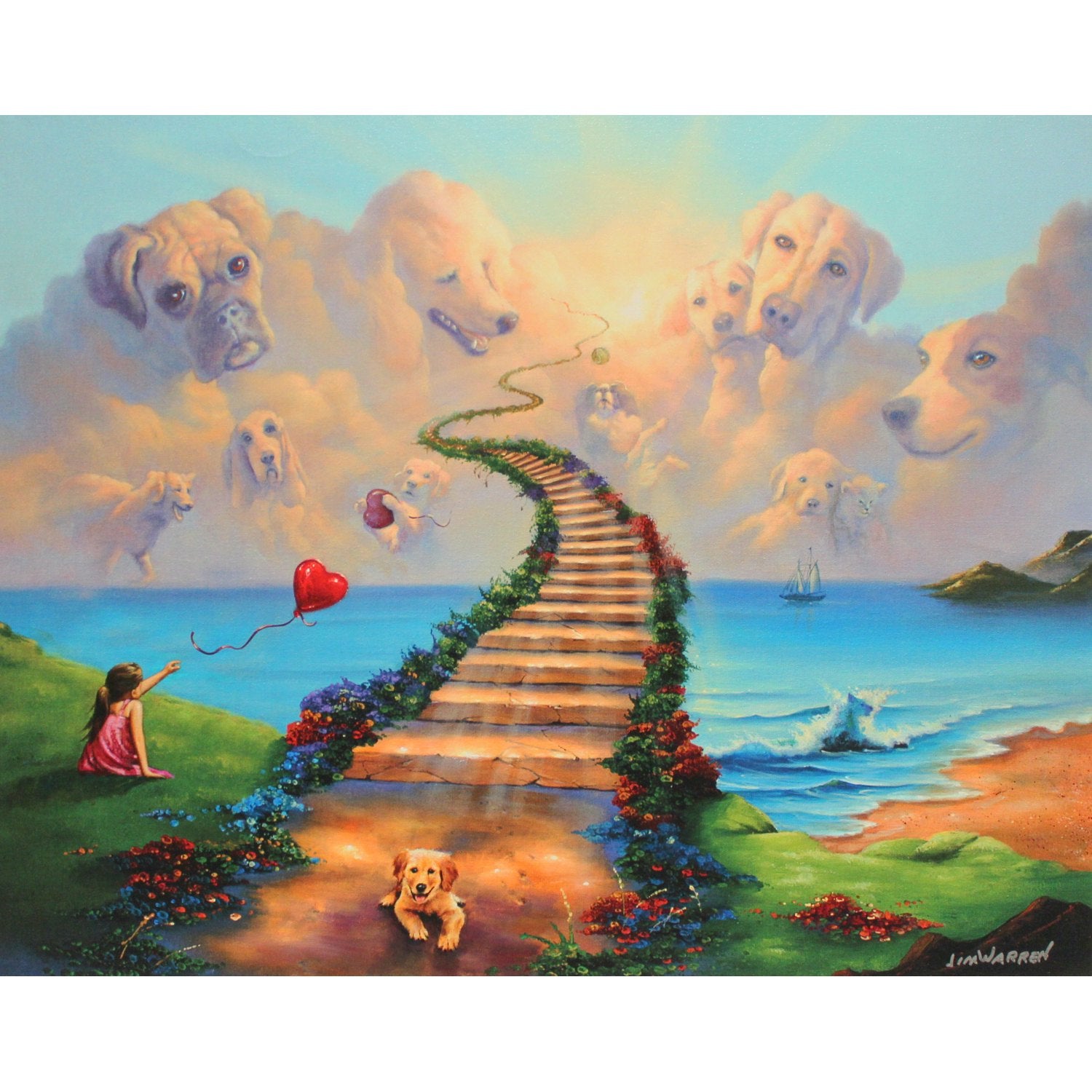 Jim Warren created All Dogs Go to Heaven as a tribute to the enduring bond between humans and their pets, especially dogs. The surreal staircase ascending into the clouds, lined with flowers and watched over by ethereal canine faces, represents the "rainbow bridge"—a popular metaphor for the peaceful afterlife where beloved pets are believed to wait for their owners. It's not just a fantasy scene; it's a visual expression of comfort, remembrance, and the hope of reunion.