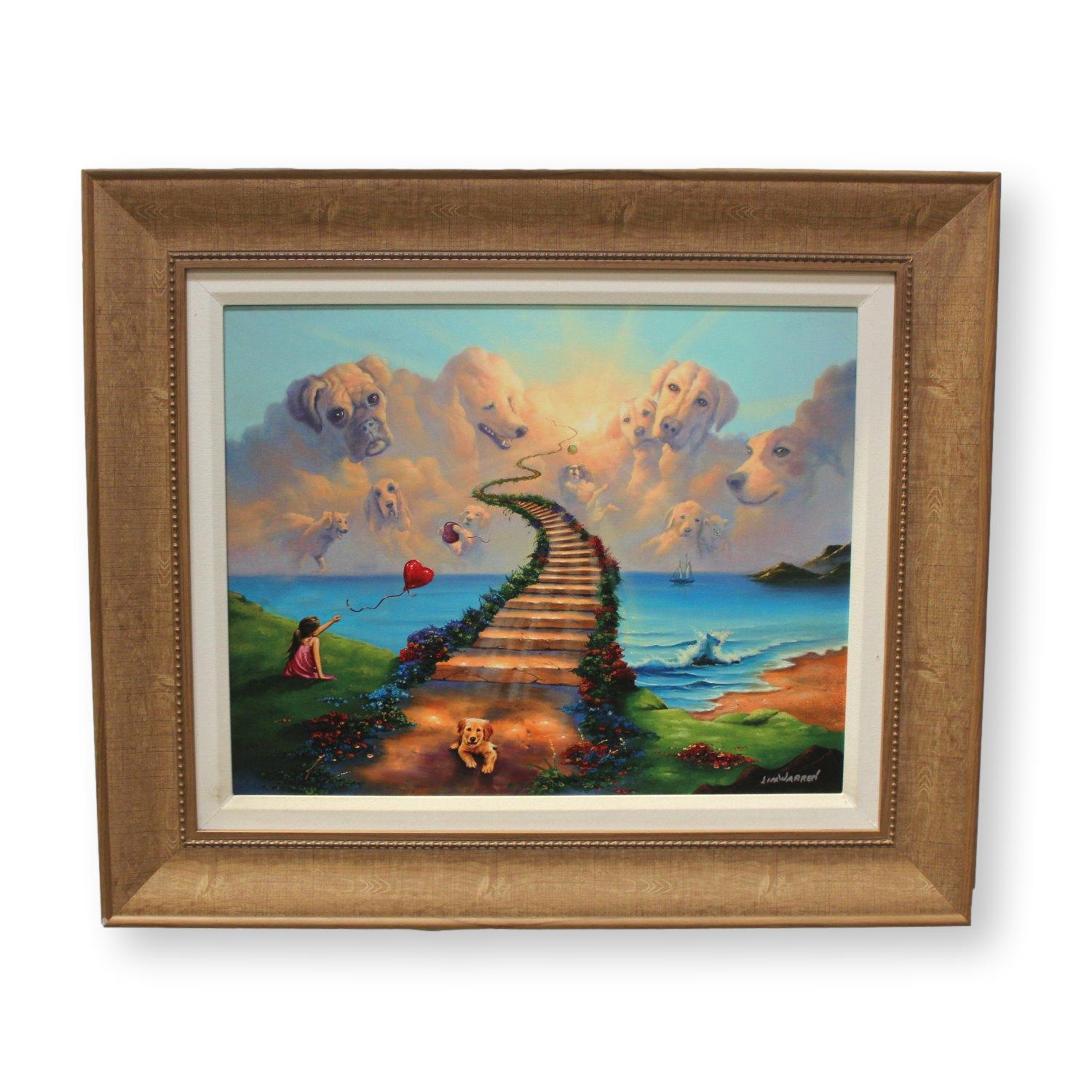 Limited edition print (#20/450) featuring a surreal staircase ascending into the clouds, surrounded by flowers, ocean views, and ethereal dog faces in the sky. A golden dog and red balloon anchor the emotional scene, evoking themes of remembrance and peaceful transition.