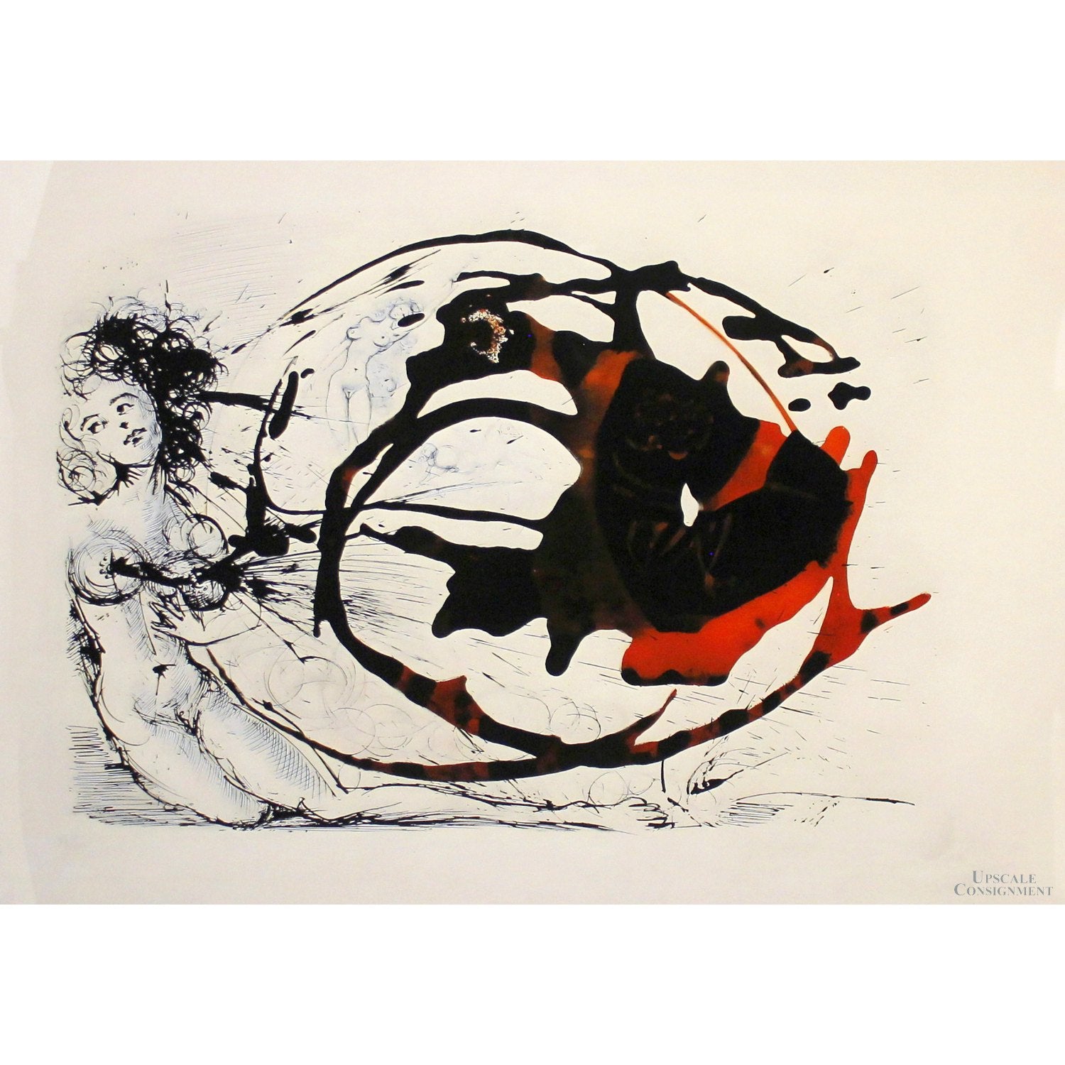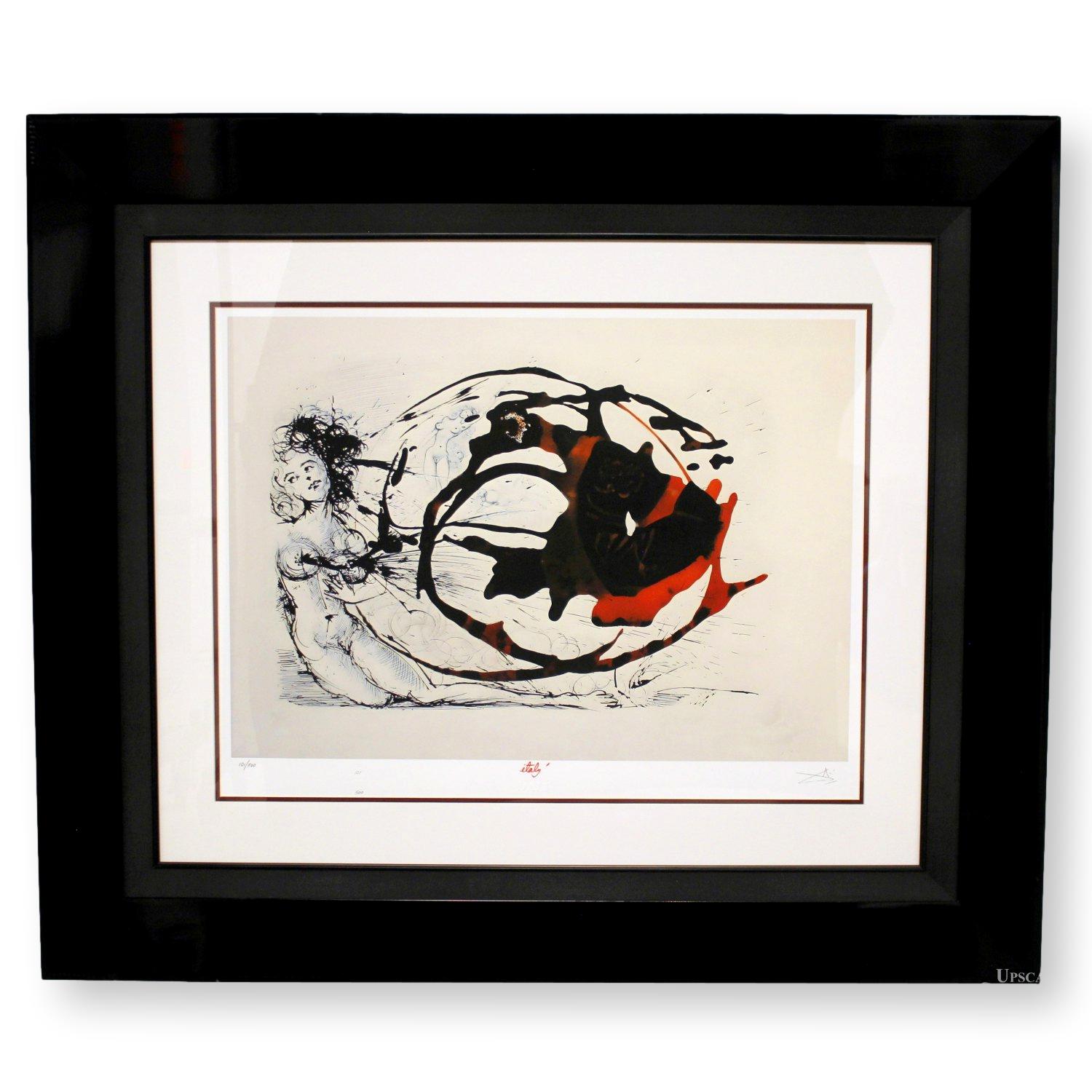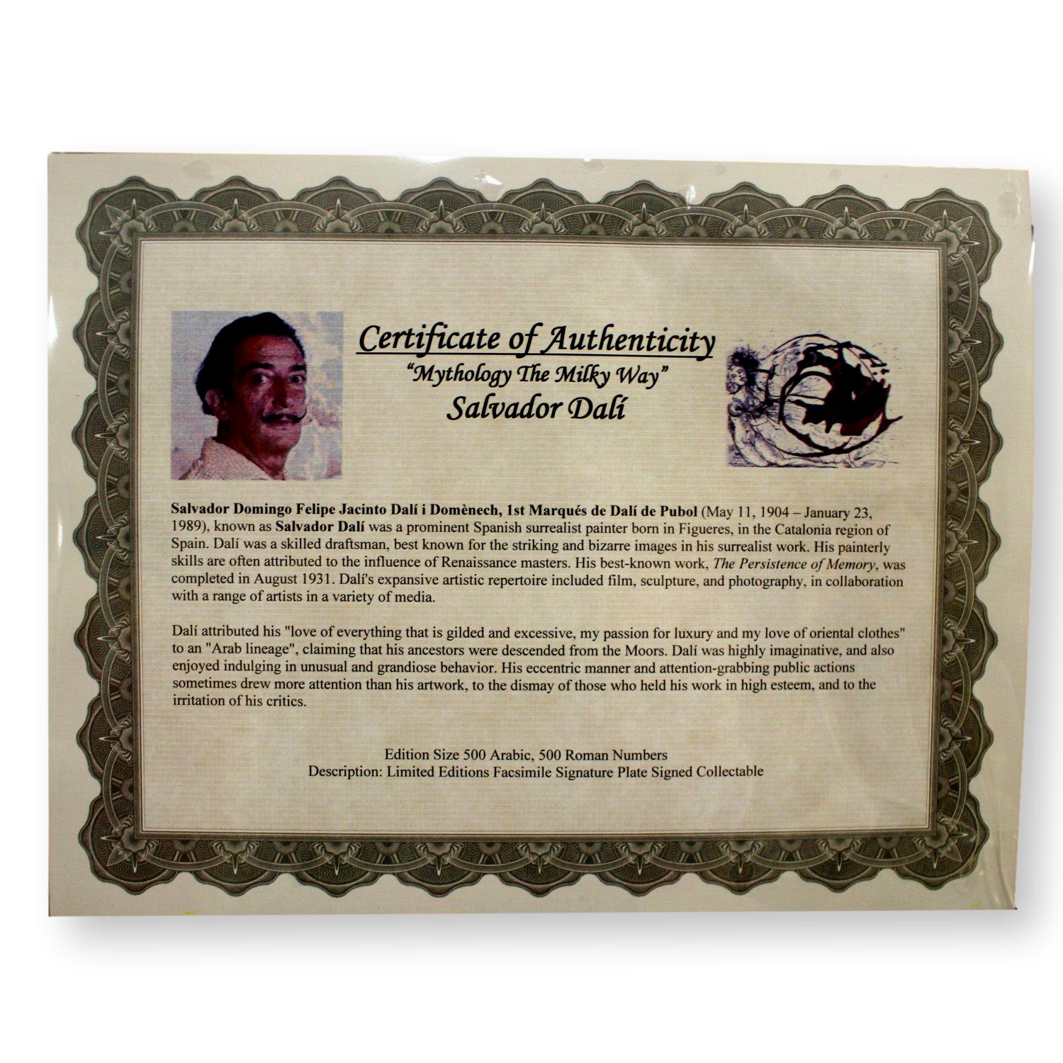"Mythology The Milky Way" depicts a female nude and supposedly Dali’s interpretation of the formation of the Galaxy. Features a black frame and artist bio. 42"(h) x 48"(w).
