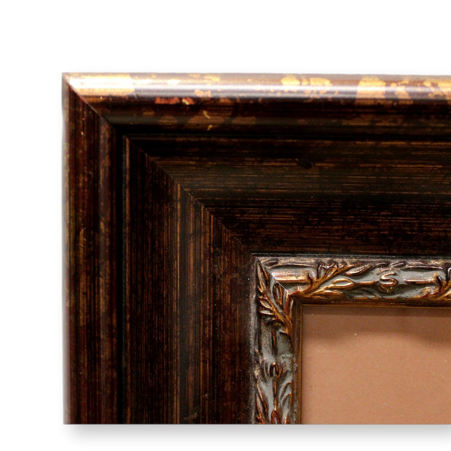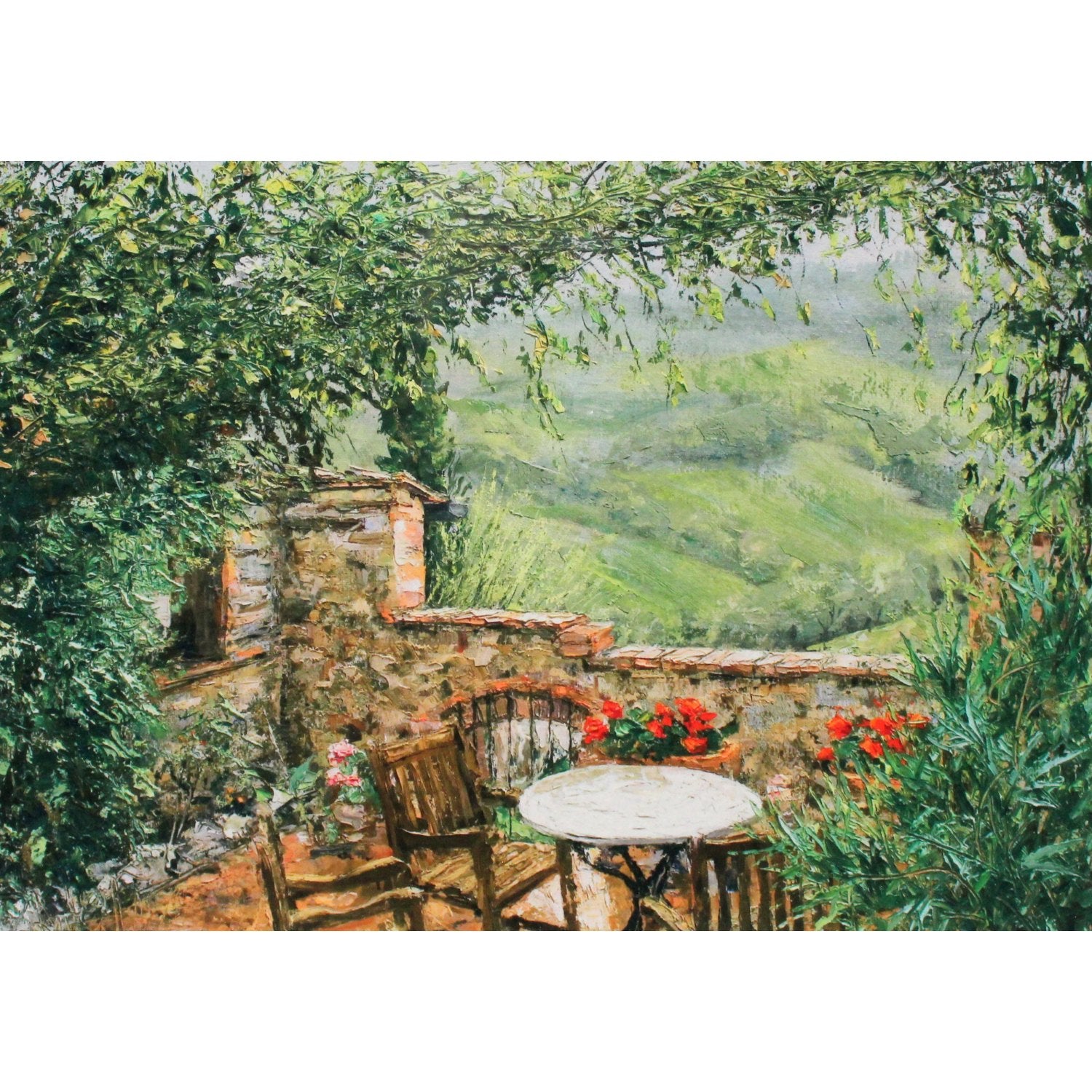 Framed watercolor lithograph depicting a serene stone patio with a round table and chair, surrounded by vibrant red flowers and lush greenery. The scene overlooks rolling countryside hills, enclosed in a dark ornate wooden frame with a brown matte border.