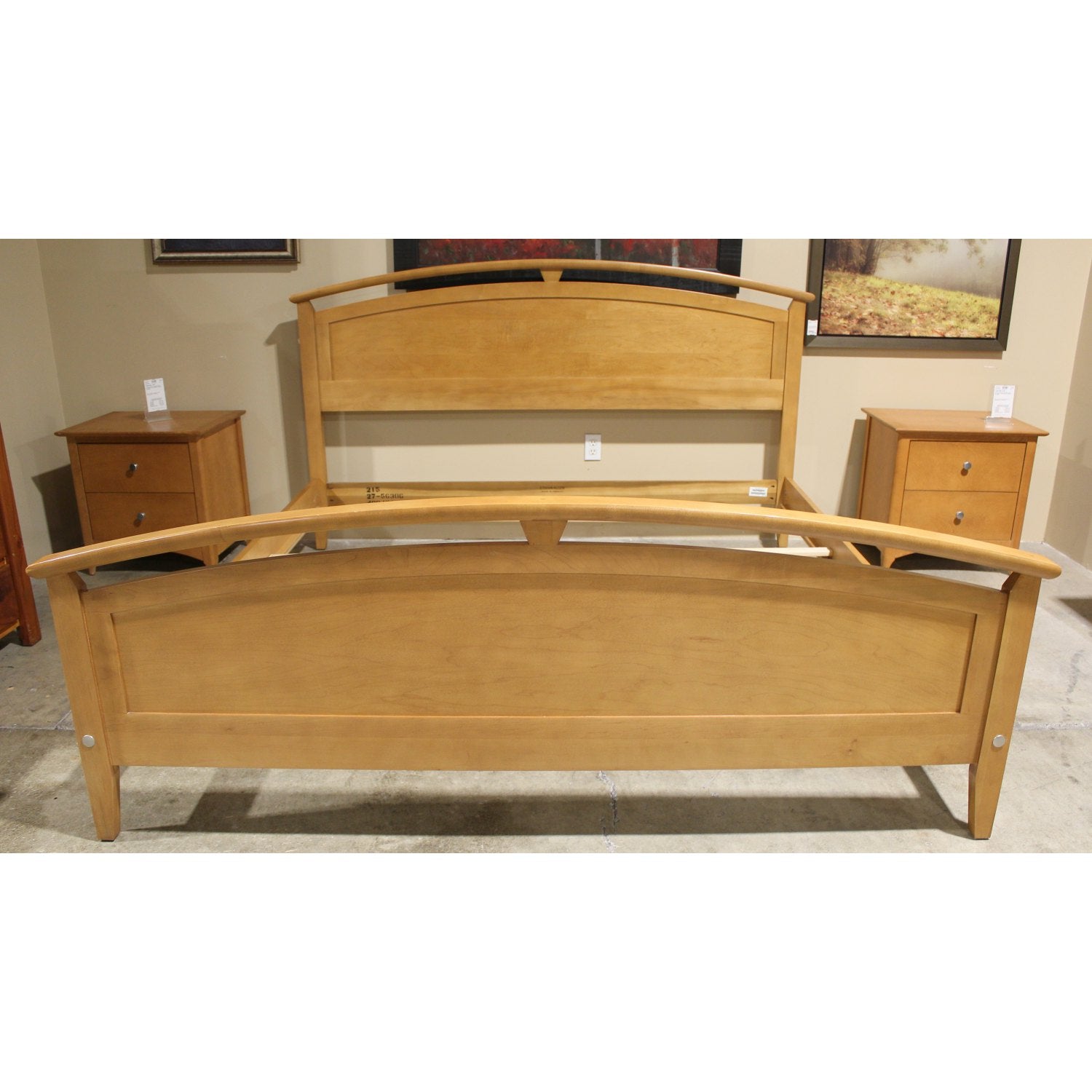 Solid maple king bed frame with a natural finish and gently arched headboard and footboard. The design features solid panel construction with a decorative top curve and clean vertical edges. Side rails and support slats are included for mattress stability. The overall silhouette balances traditional shaping with a straightforward, craftsman-inspired build.