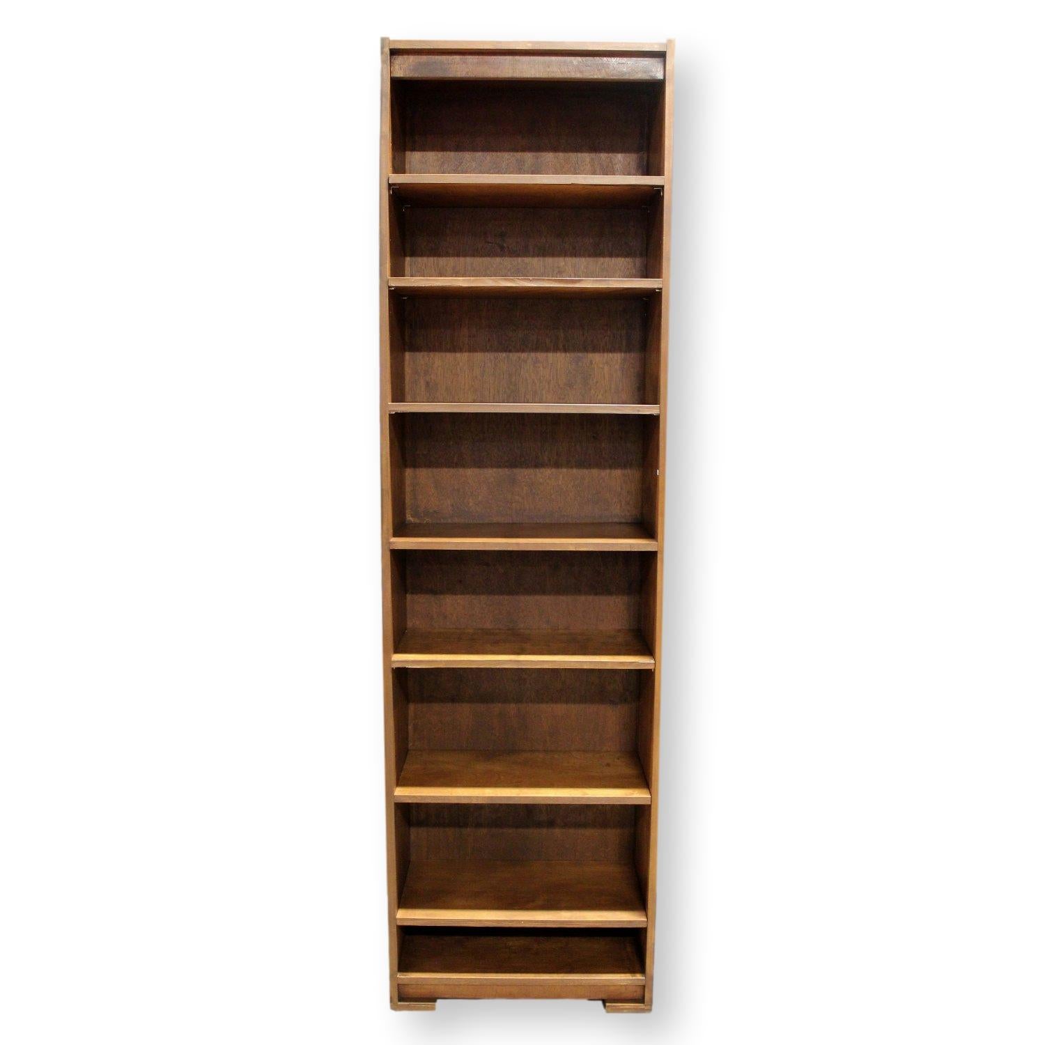 Tall and narrow with a clean-lined silhouette, this open bookshelf features seven adjustable shelves in a light walnut tone. The veneered surfaces highlight subtle wood grain variations, and the rectangular frame offers a straightforward vertical storage solution. Its unembellished design suits utilitarian or minimalist interiors.