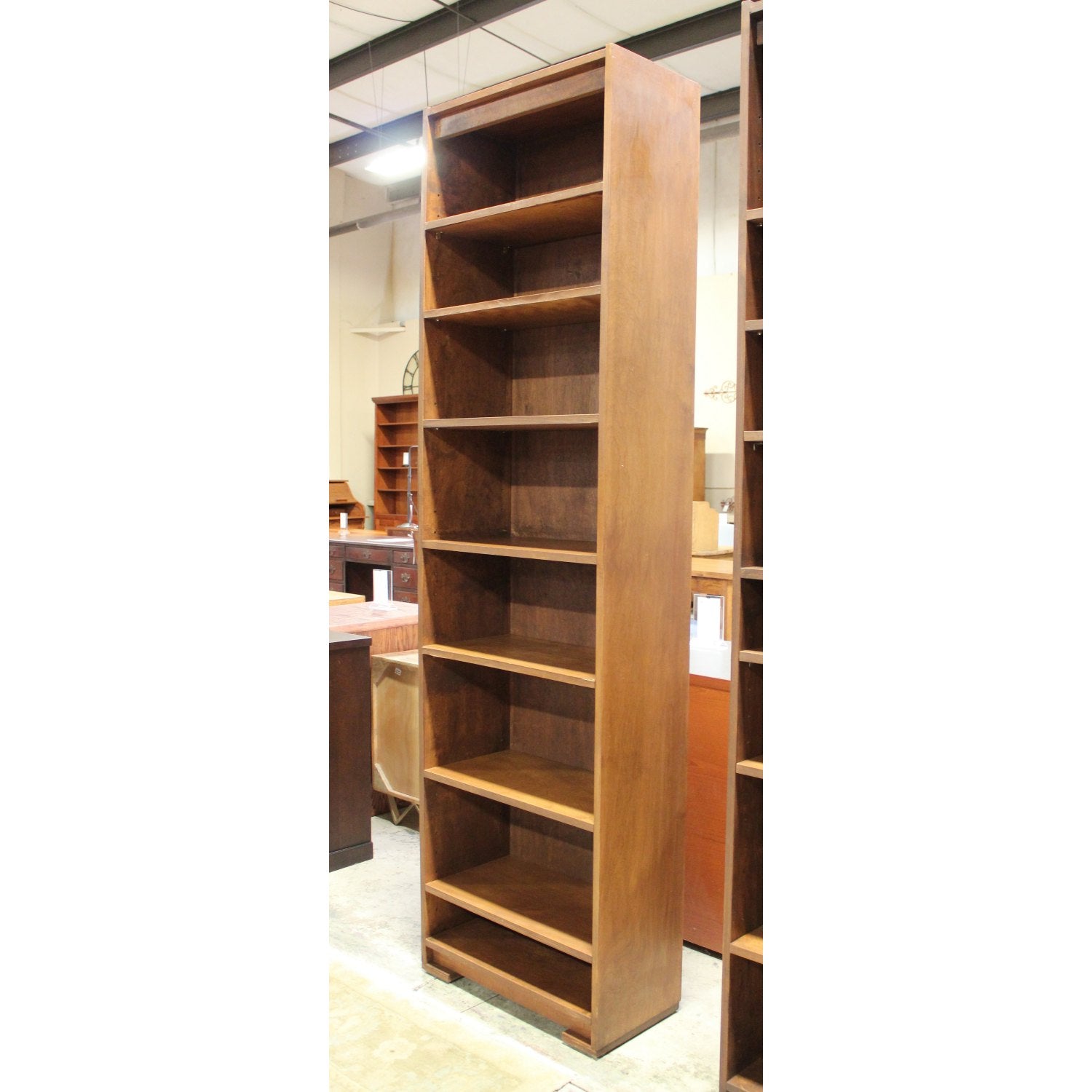 Tall and narrow with a clean-lined silhouette, this open bookshelf features seven adjustable shelves in a light walnut tone. The veneered surfaces highlight subtle wood grain variations, and the rectangular frame offers a straightforward vertical storage solution. Its unembellished design suits utilitarian or minimalist interiors.