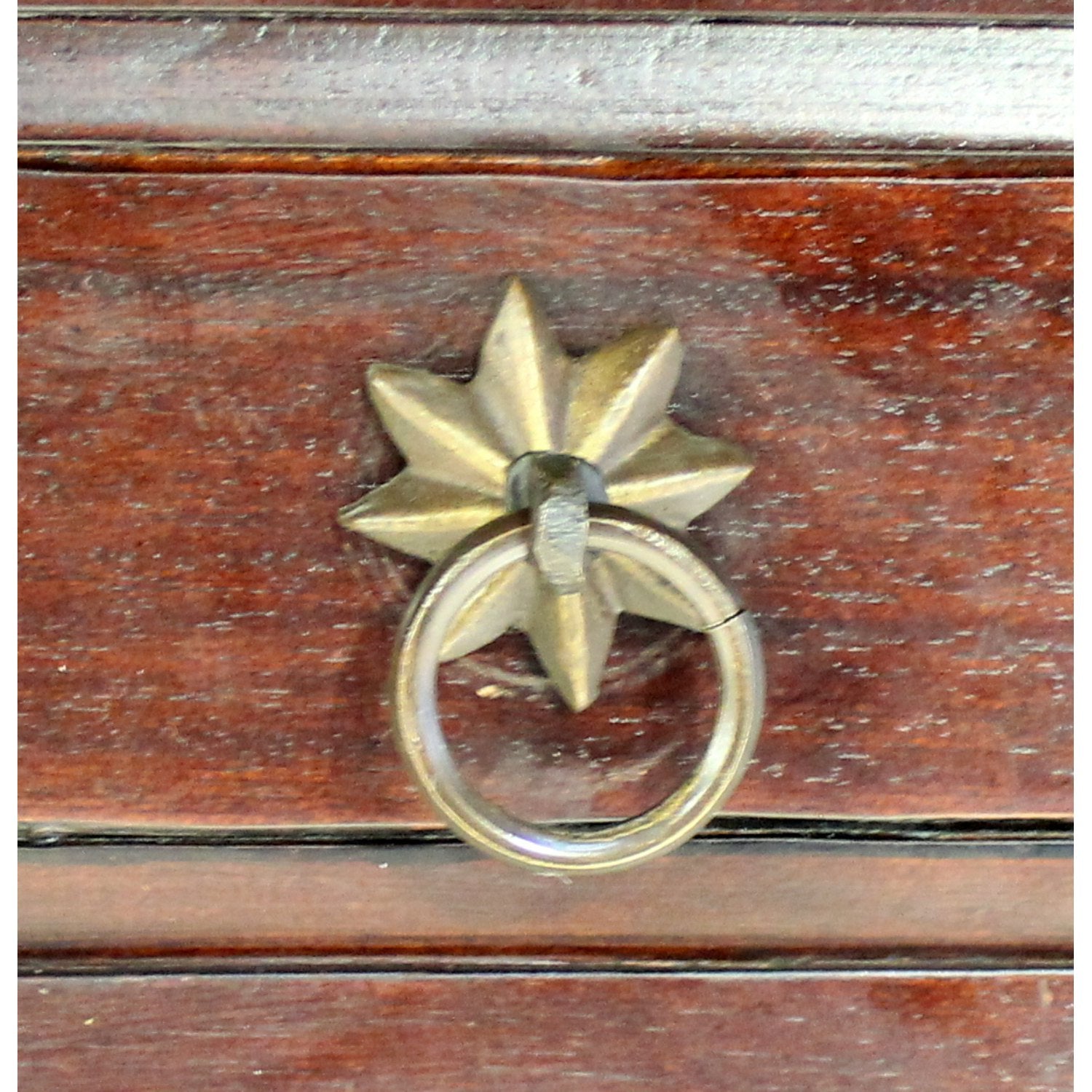Traditional-style cabinet in a rich espresso finish featuring two upper drawers with decorative metal pulls. Below, a central open shelf offers accessible storage, and 2 paneled doors with vertical slats and matching hardware. Side columns and a molded base add subtle architectural detail. Suitable for entryway, dining, or living room use. Made in India.