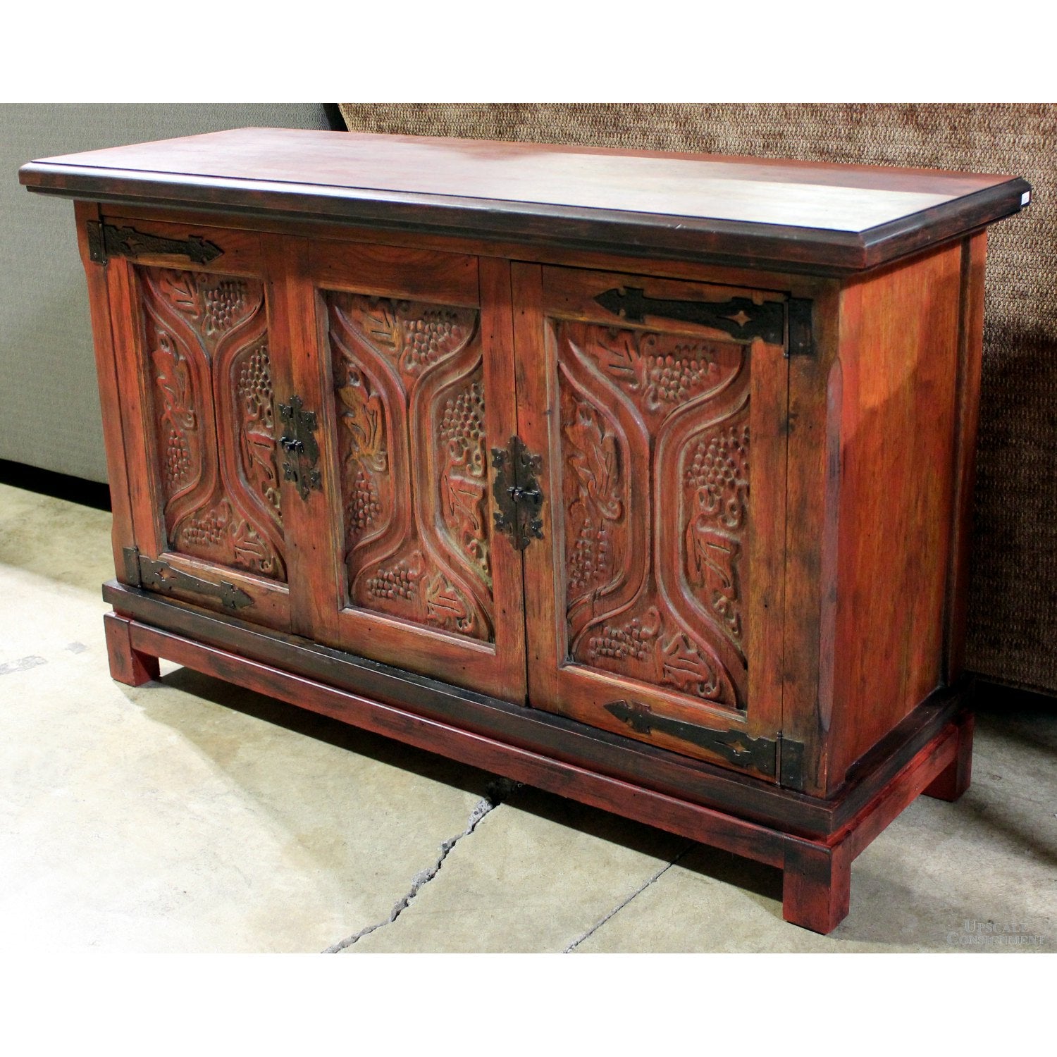 Three carved panels depict stylized grapevine motifs across the front of this oak cabinet, with the left and right panels being doors framed by ornate metal hinges and handles, and the middle panel stationary. The wood has a distressed reddish finish that highlights the depth of the carving and adds warmth to the overall tone. Short block feet support the solid base, and the piece offers enclosed storage behind its hinged doors.