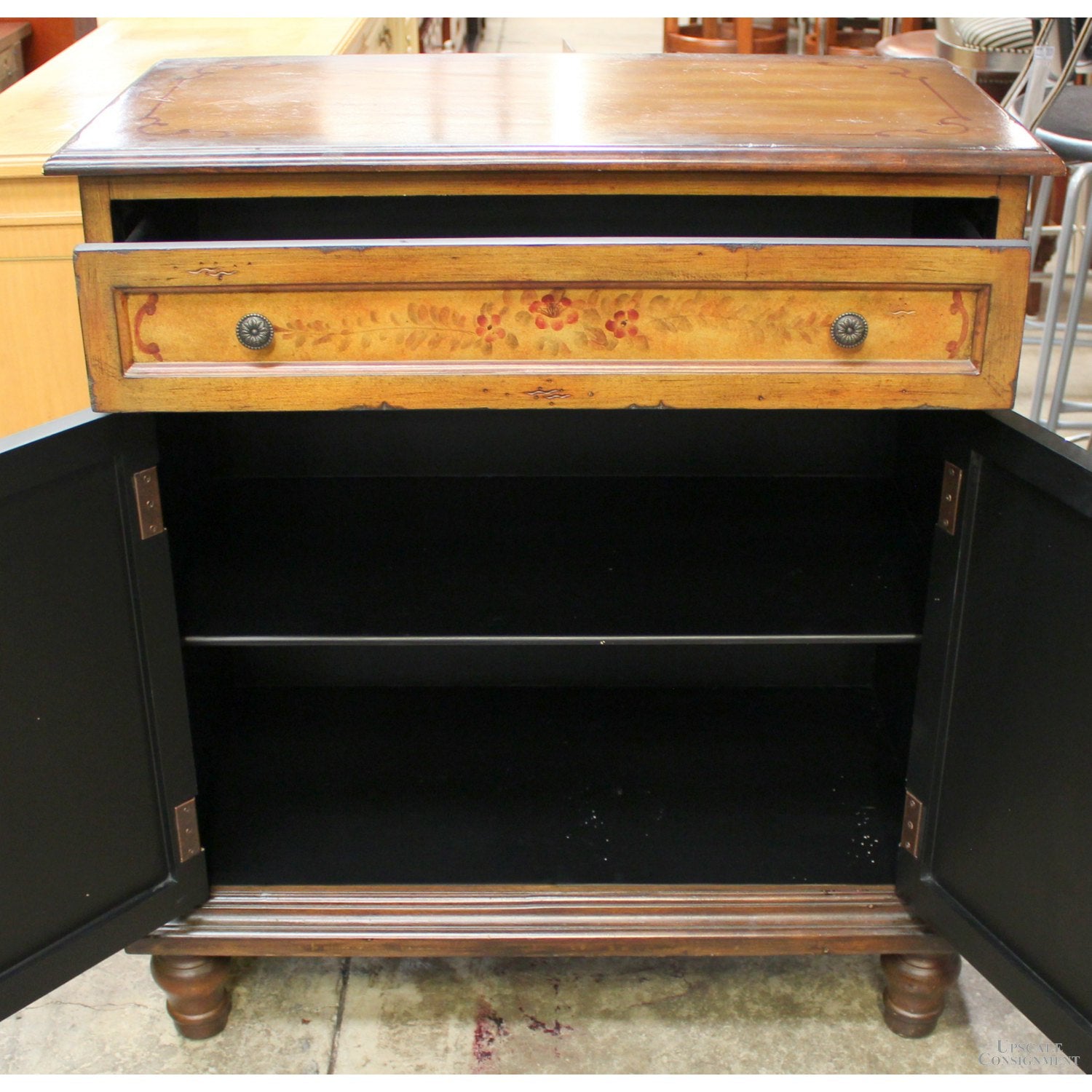 Features a mottled golden yellow finish with factory distressing, painted floral designs, a 1 drawer/2 door configuration, and antique brass hardware.