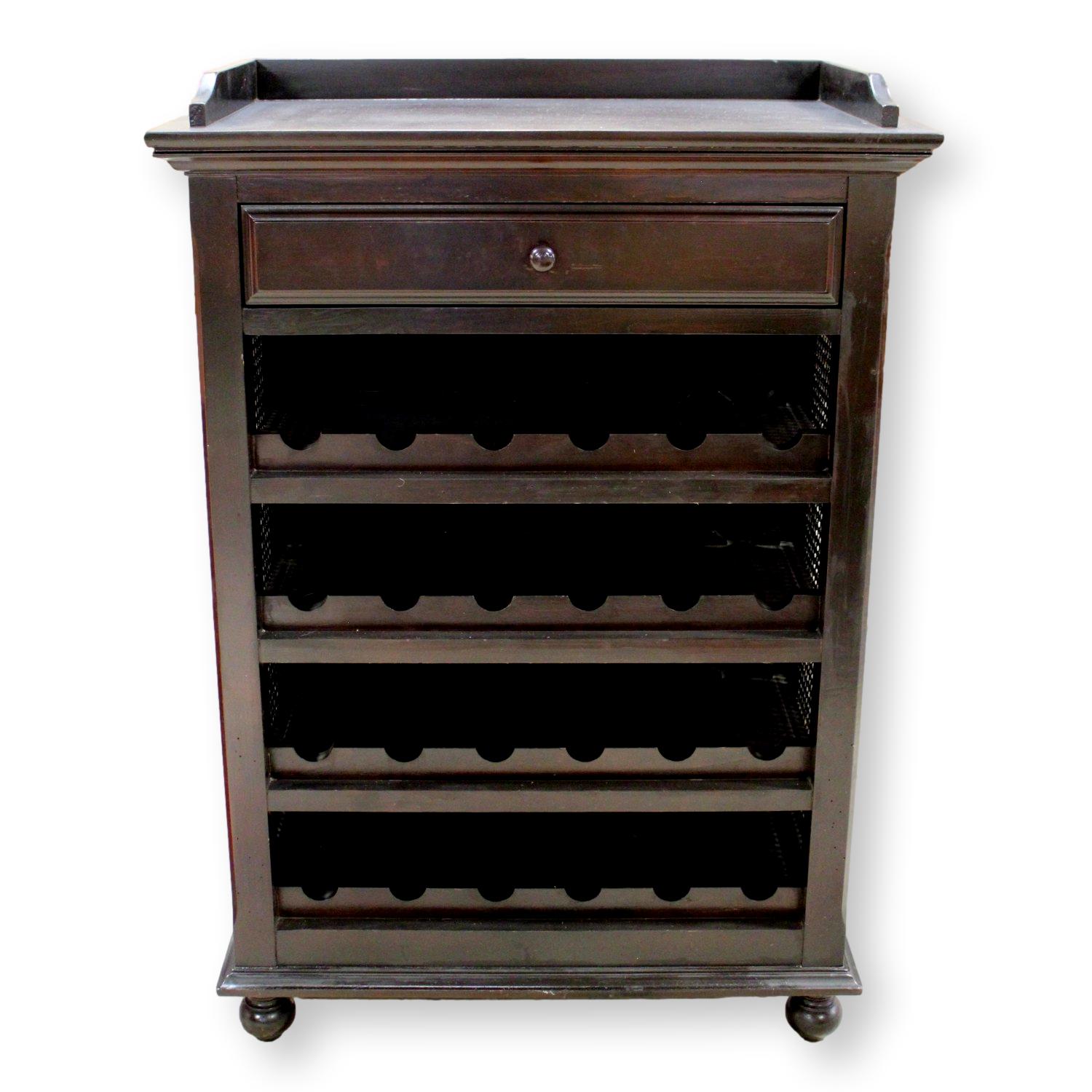 Dark-stained cherry wood cabinet with scalloped shelves for wine bottle storage, mesh-paneled sides, and a top drawer for accessories. Stands on rounded feet with a raised-edge top surface suitable for display or additional storage.