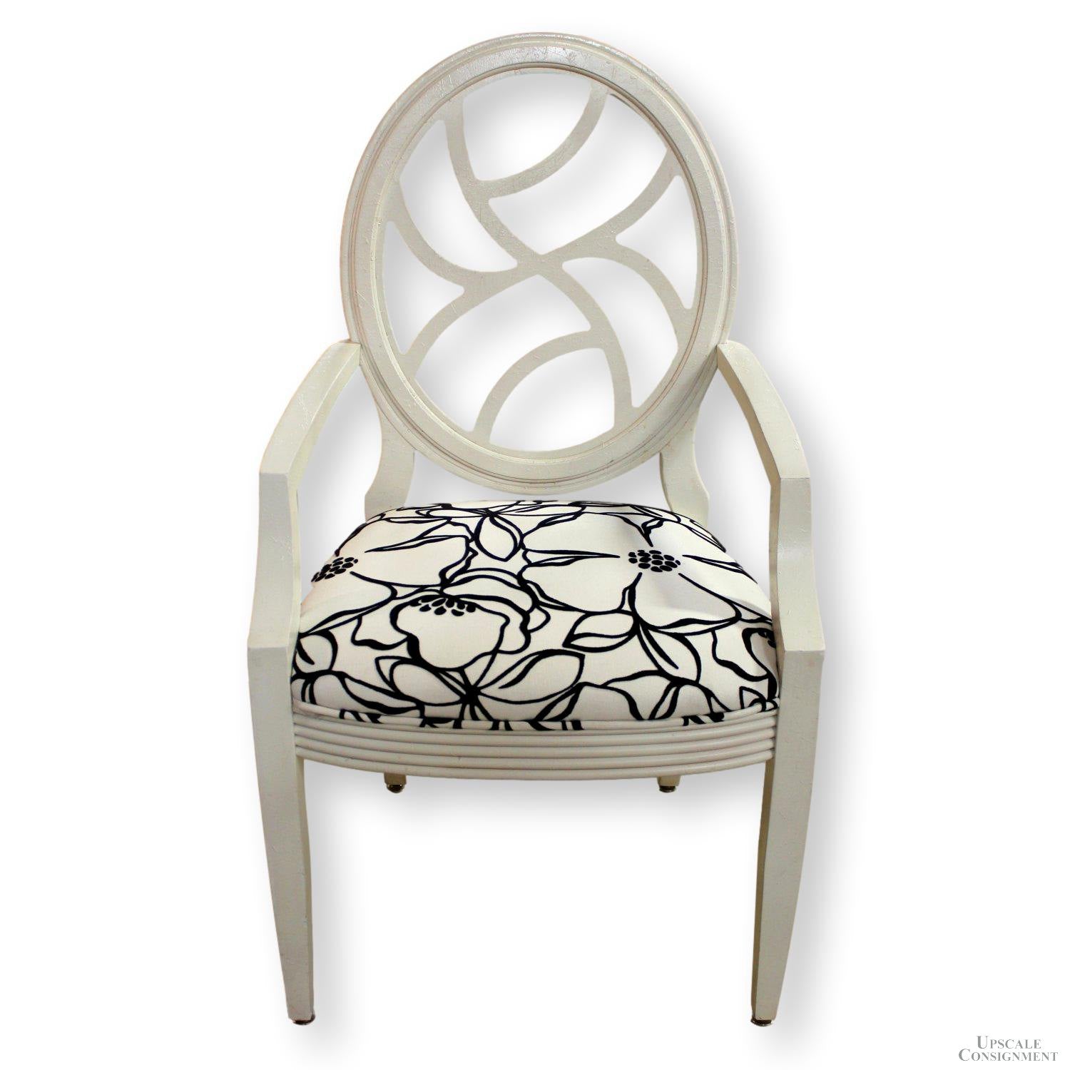 White wooden armchair with an oval backrest featuring an abstract cut-out design and straight angular arms. Upholstered seat in bold black floral fabric on a white background adds contrast to the sculptural frame.