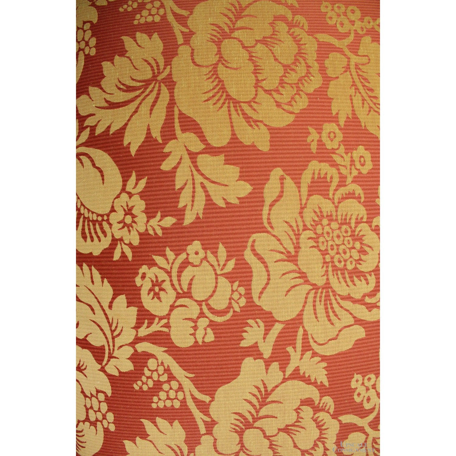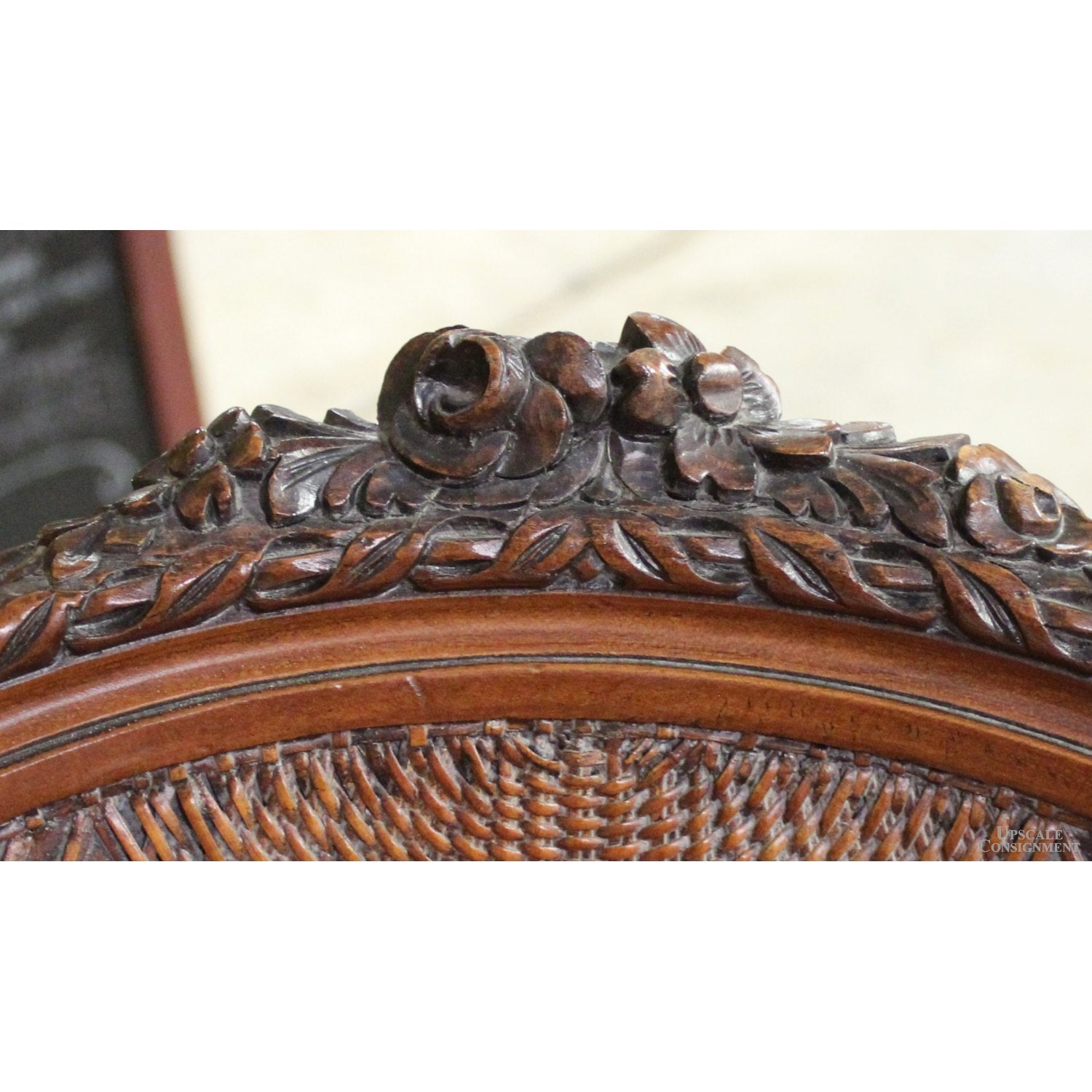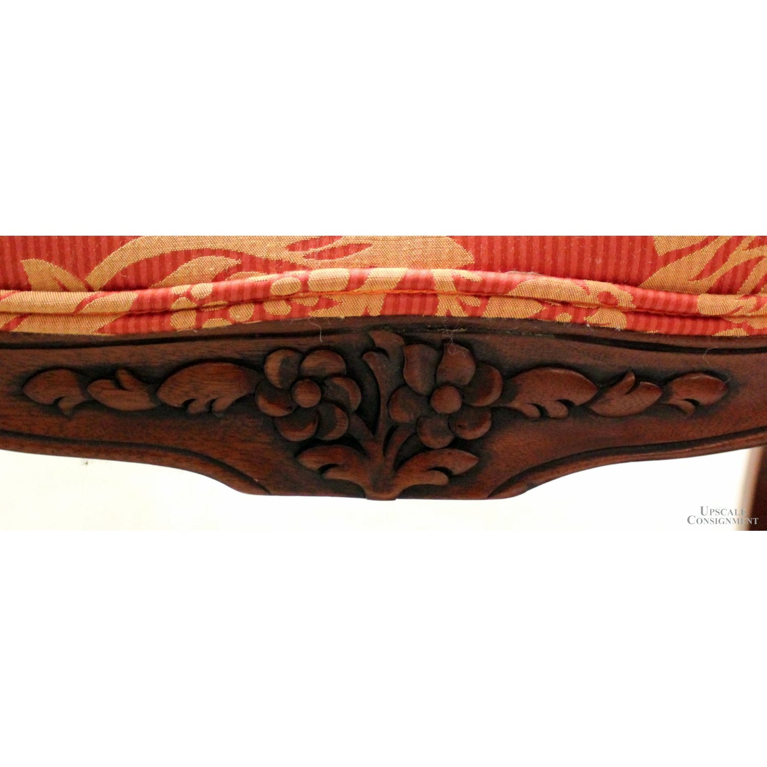 Vintage-style armchair with a carved dark wood frame, rounded cane back, and cabriole legs. Upholstered in red and gold floral medallion fabric across the seat, padded armrests, and matching ottoman. Ottoman measures 18'' high by 27'' wide and 21'' deep, with a gently curved apron and carved feet echoing the chair’s silhouette. The set reflects French-inspired craftsmanship with bold textile contrast and decorative detailing.
