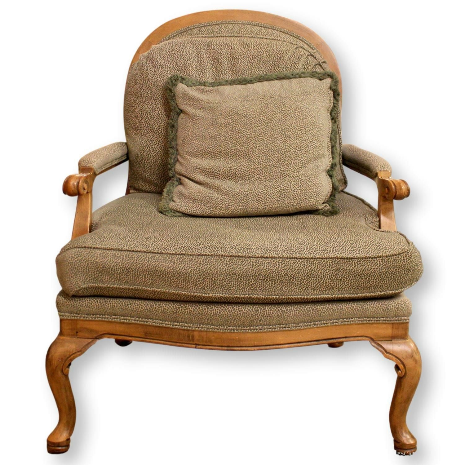 Features factory rustic pecan finish frame, textured green chenille upholstery with dense speckled pattern, welted trim, arched back, reversible back & seat cushions, and includes matching throw pillow with fringe.