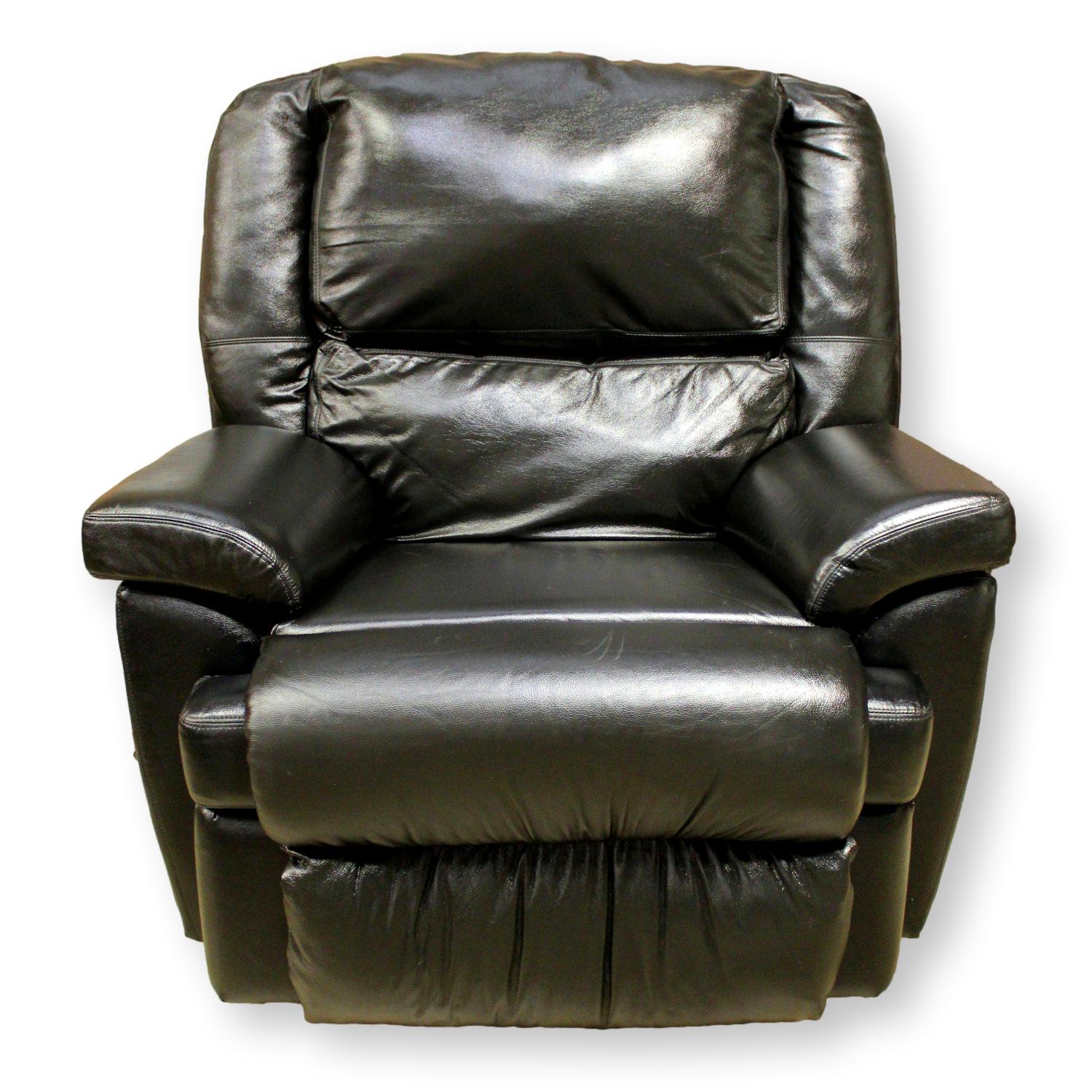Upholstered in black leather with vinyl match on secondary surfaces, this rocker recliner features a generously padded seat, high backrest, and wide pillow-style arms. The side-mounted lever activates a smooth reclining motion with an integrated footrest. Its compact silhouette and subtle stitching lend a clean, functional look suited to casual interiors.