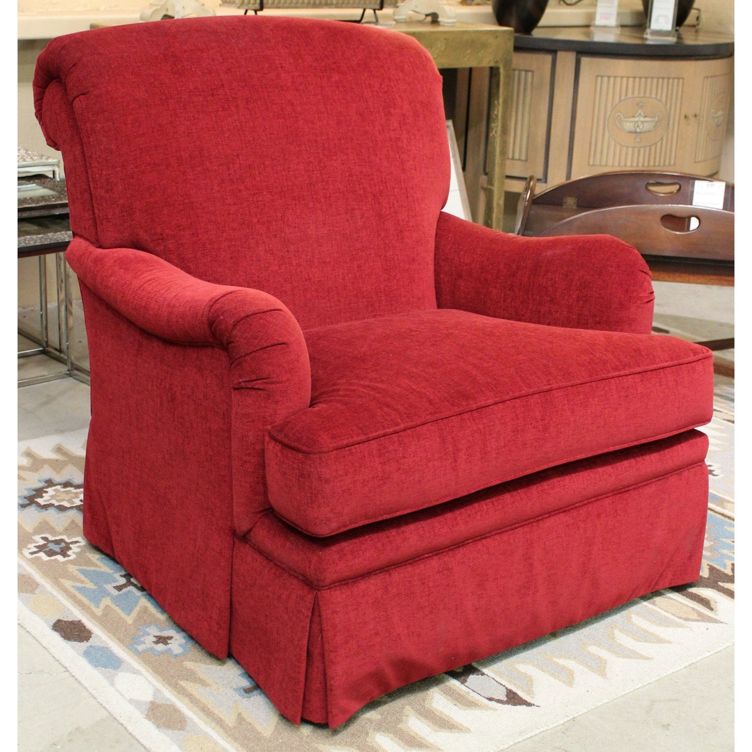Upholstered in textured red fabric, this chair features a high backrest, cushioned seat, and tailored skirt that conceals the legs for a traditional finish. The English-style arms are gently rolled and padded, offering a soft silhouette that complements the formal profile. Its structured proportions and classic detailing suit both vintage and transitional interiors.