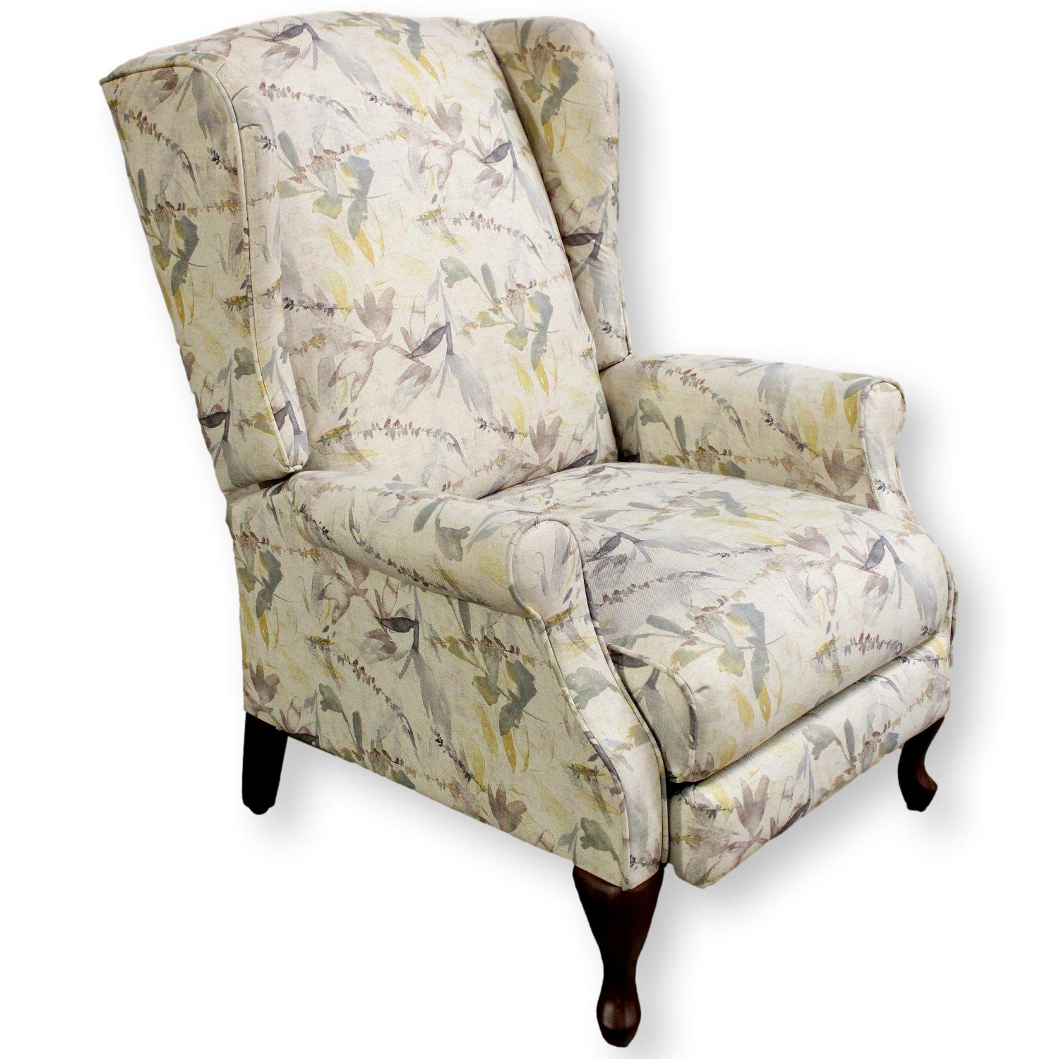 Traditional wingback recliner with rolled arms and cabriole legs in a dark wood finish. Upholstered in a muted leaf and branch print featuring beige, gray, green, and yellow tones. High back and winged sides provide support and enclosure. Push-back reclining mechanism.
