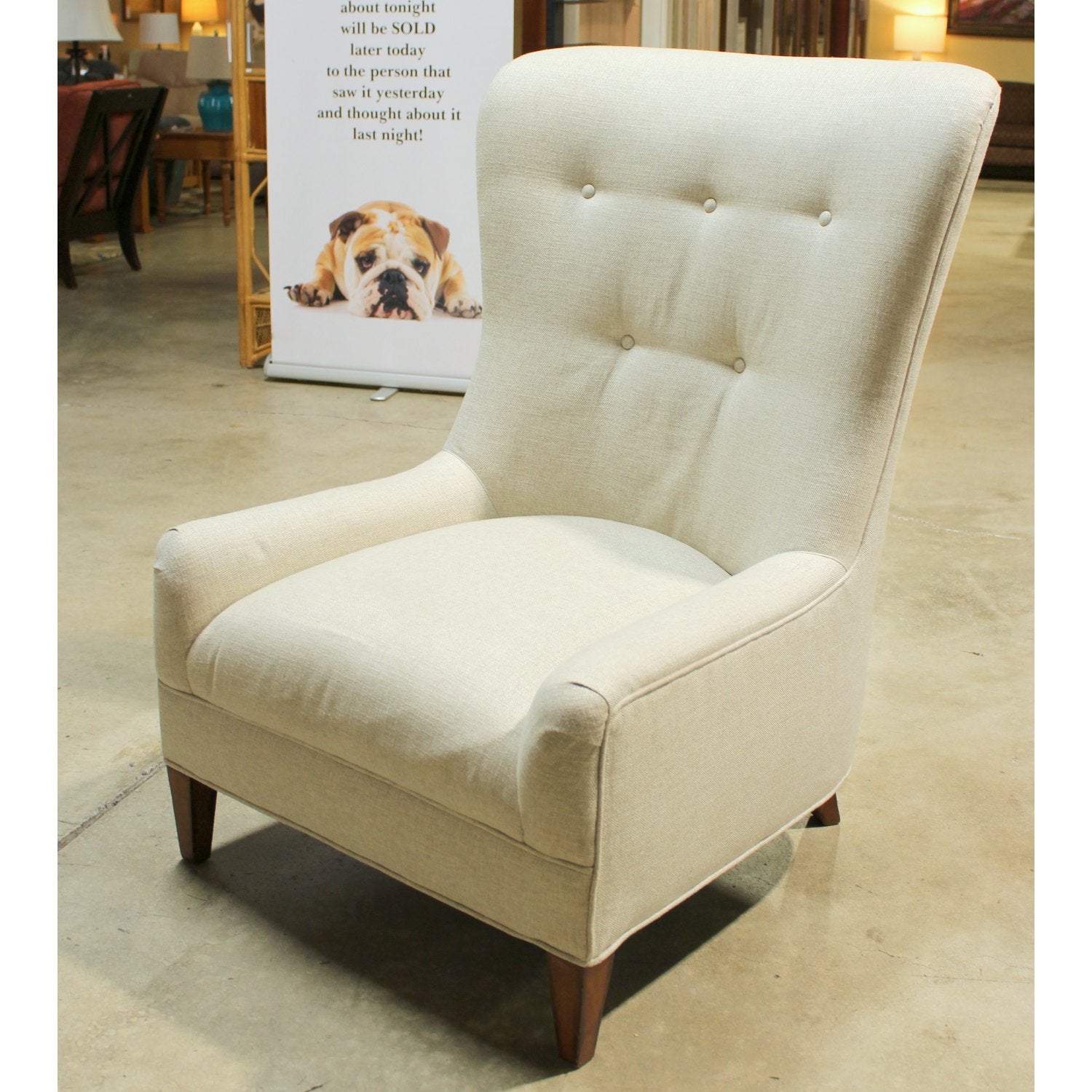 Light gray upholstery wraps a tall, winged backrest with a clean, modern profile. The back features a simple five‑button tufted pattern arranged in two rows. Smooth, slightly flared armrests and a cushioned seat rest on tapered wooden legs for a balanced, tailored look.