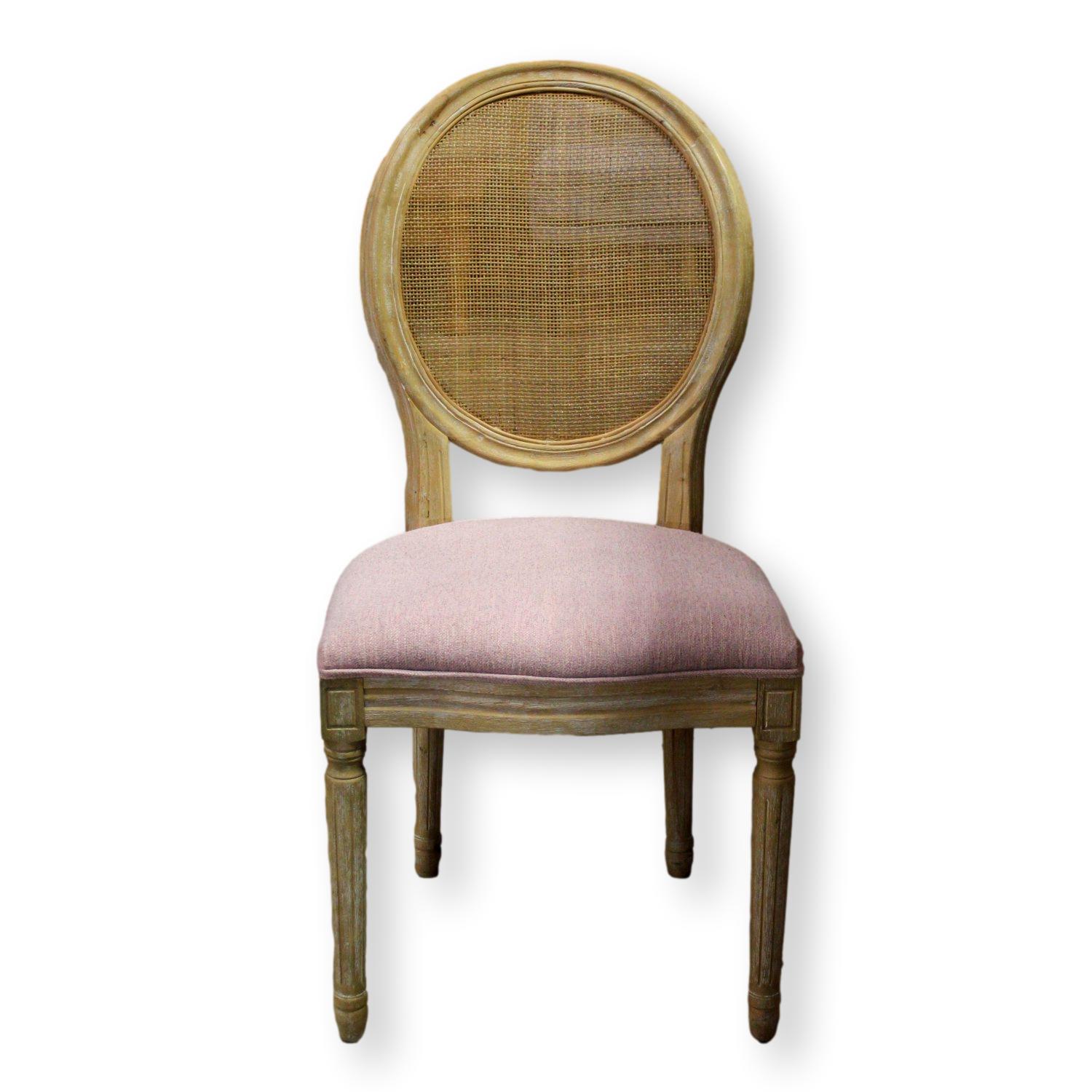 Vintage-style side chair featuring an oval woven cane backrest and carved wood frame with a distressed finish. The seat is upholstered in a soft rose-colored fabric, offering subtle contrast against the light-toned wood. Decorative leg detailing and curved lines reflect classic European design influences. Suitable for use as an accent or dining chair in traditional interiors.