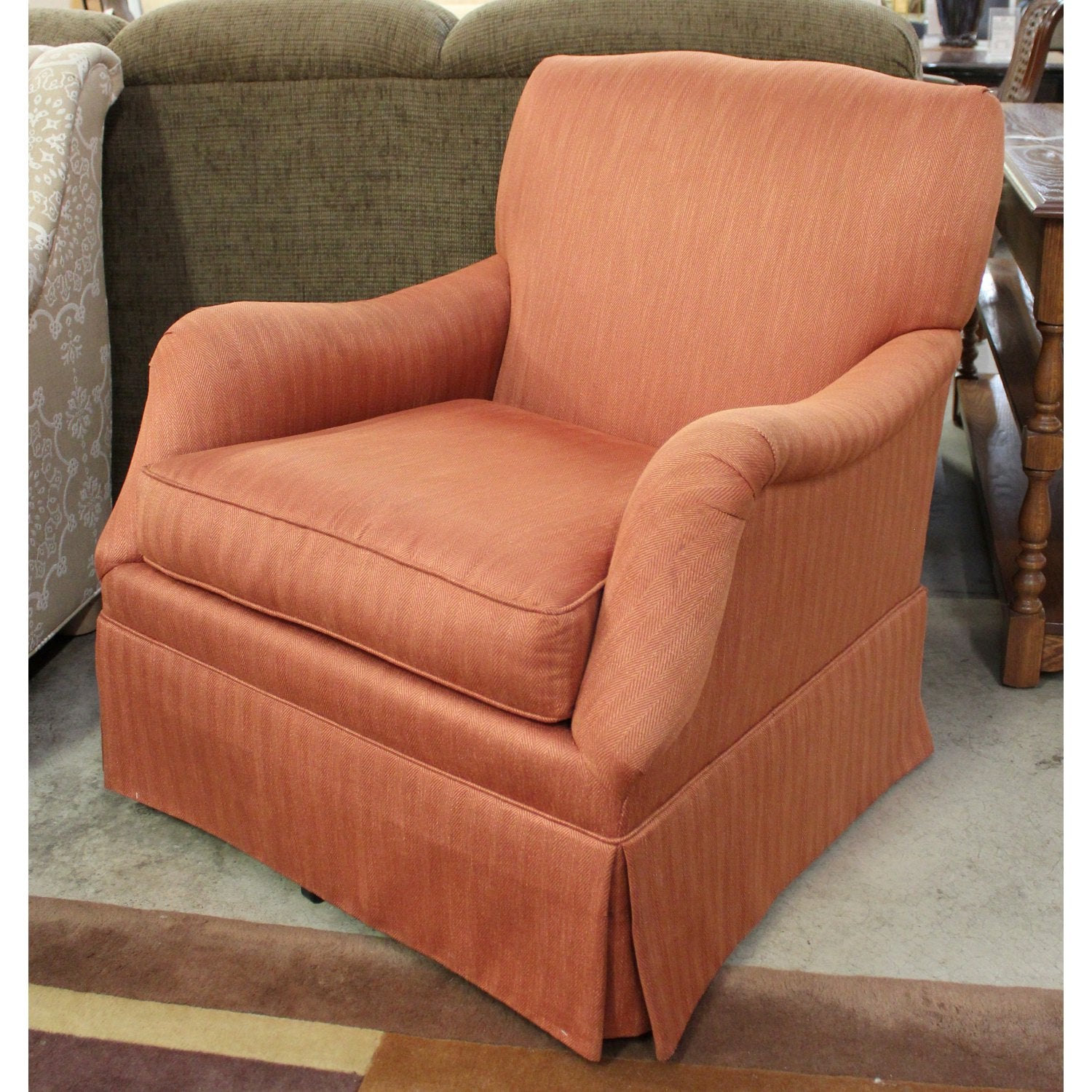 Upholstered in a pale orange fabric with subtle vertical striping, this generously scaled chair features a cushioned seat, padded backrest, and outward-curving armrests for added comfort. The skirted base conceals a swivel rocking mechanism, allowing for gentle motion without visual distraction. Its warm tone and soft contours suit both casual and traditional interiors.