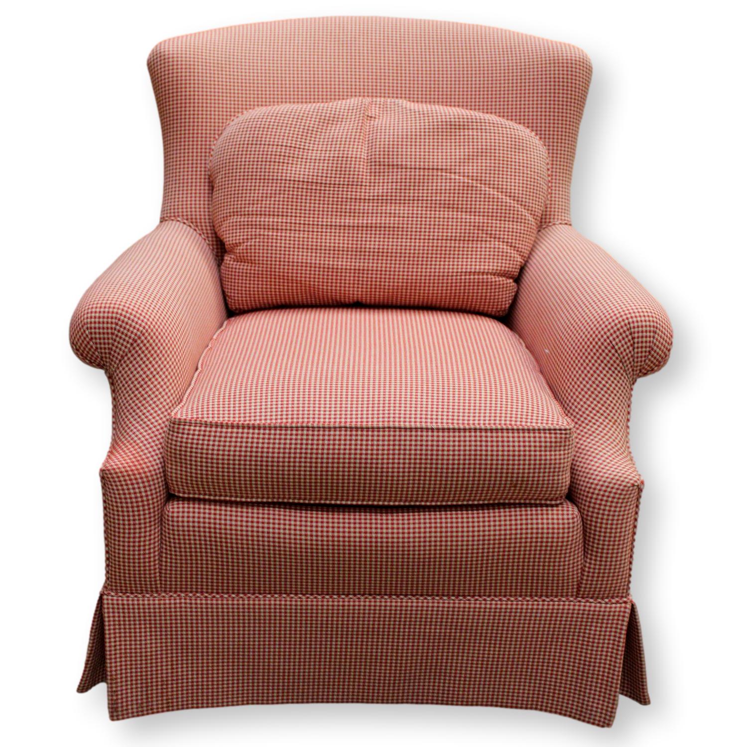 Traditional armchair upholstered in red and white gingham fabric with a skirted base and rolled arms. Includes a matching reversible seat cushion and a back pillow with pleated accents. High backrest provides full support. Suitable for casual or country-style interiors.