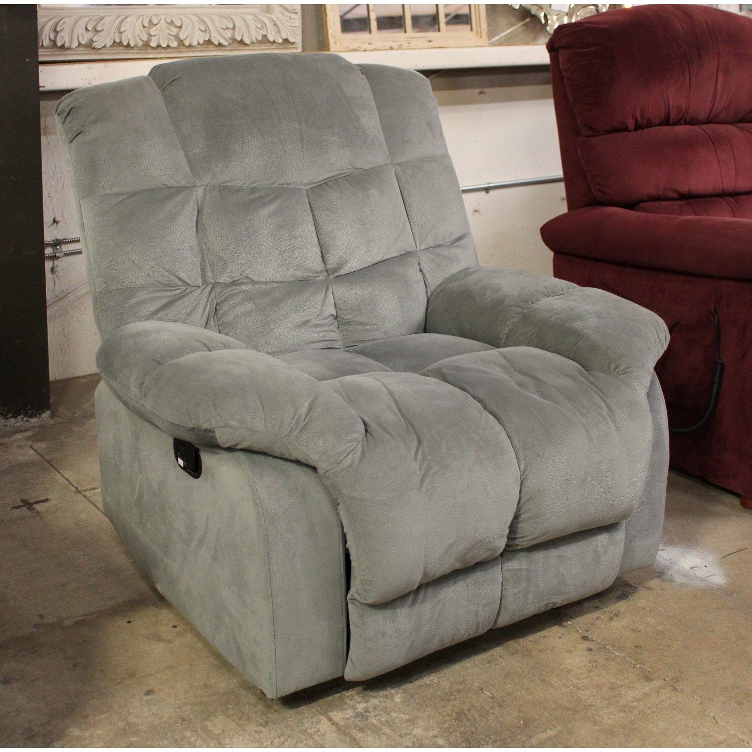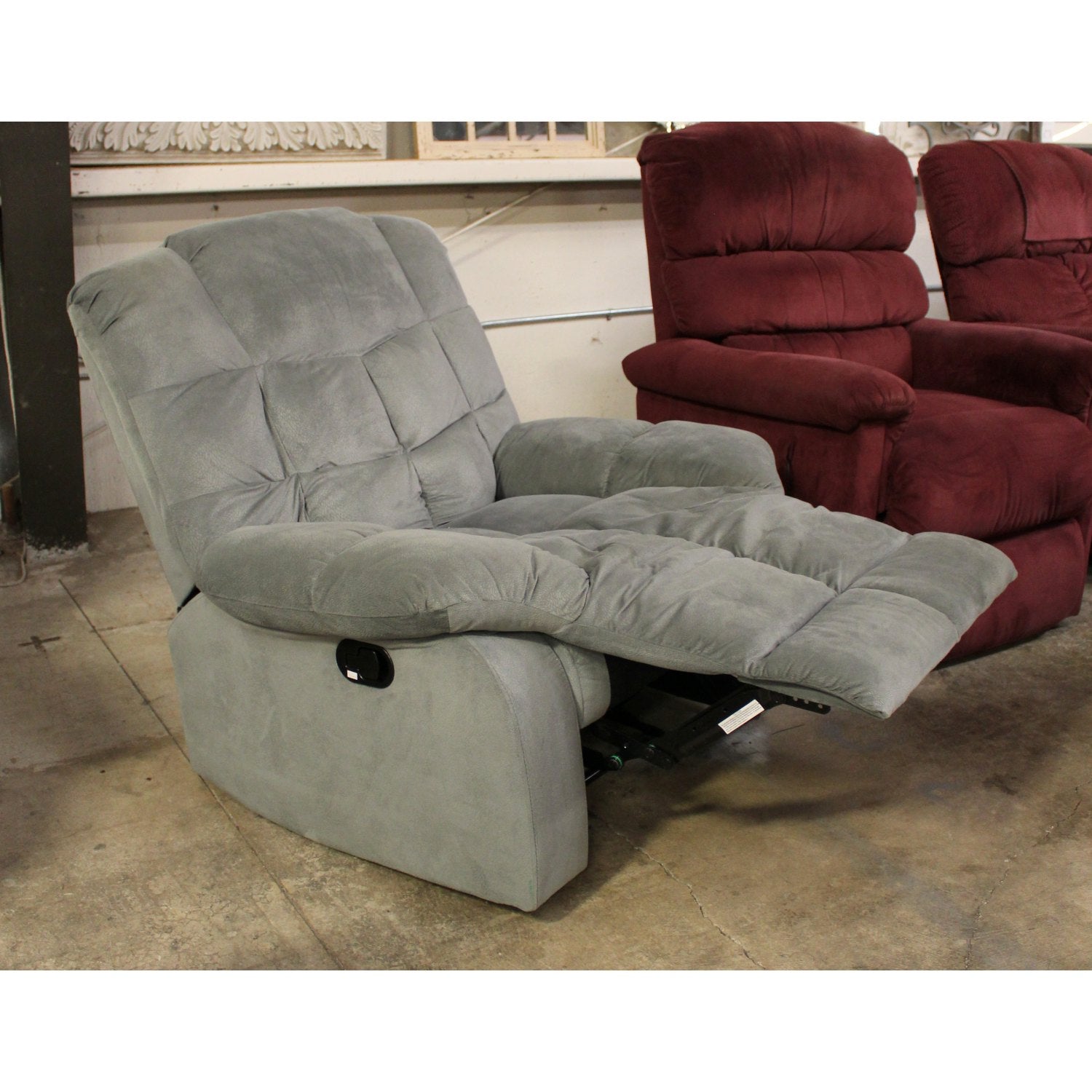 Upholstered in soft gray microfiber, this manual recliner features a square-tufted backrest and wide pillow-top arms for added support. The wall-hugger design allows full recline with minimal clearance, making it suitable for compact spaces. A side-mounted lever activates the footrest and reclining mechanism.