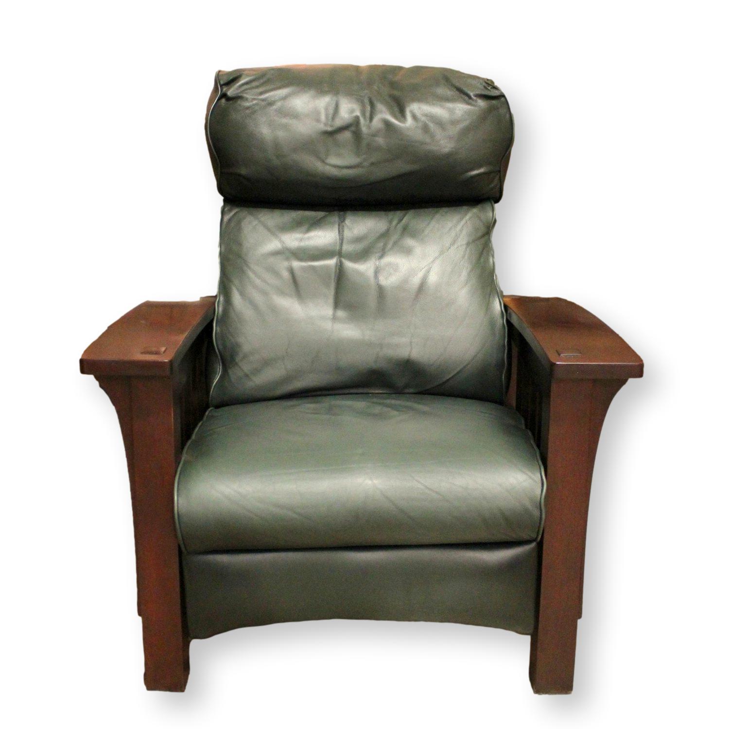 Mission-style recliner featuring a solid dark oak frame with slatted sides and wide slightly curved armrests. Upholstered in deep green leather, the seat, back, and headrest are padded for comfort. The high back and angled seat recline, supported by a solid wood base. Suitable for traditional or Craftsman-inspired interiors.