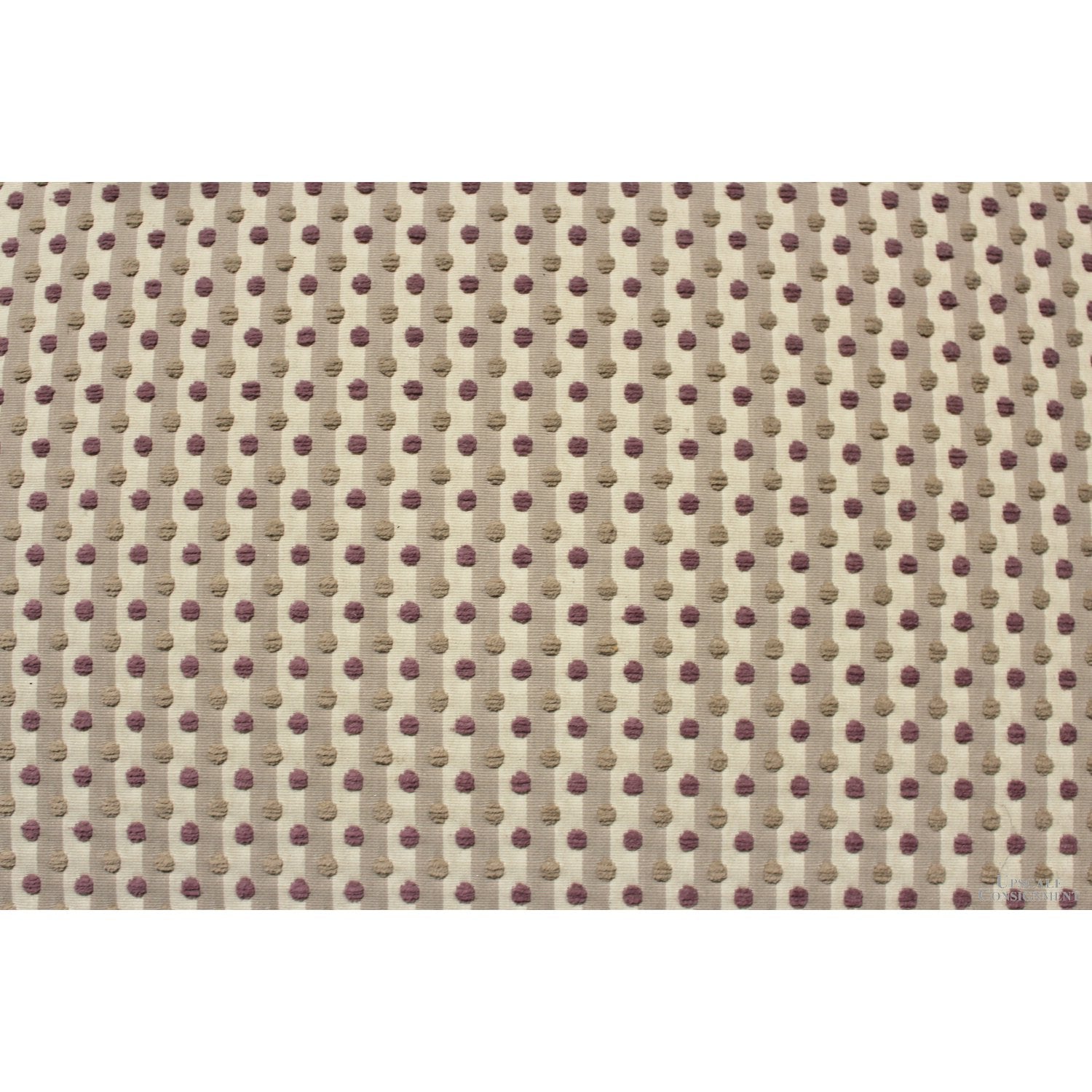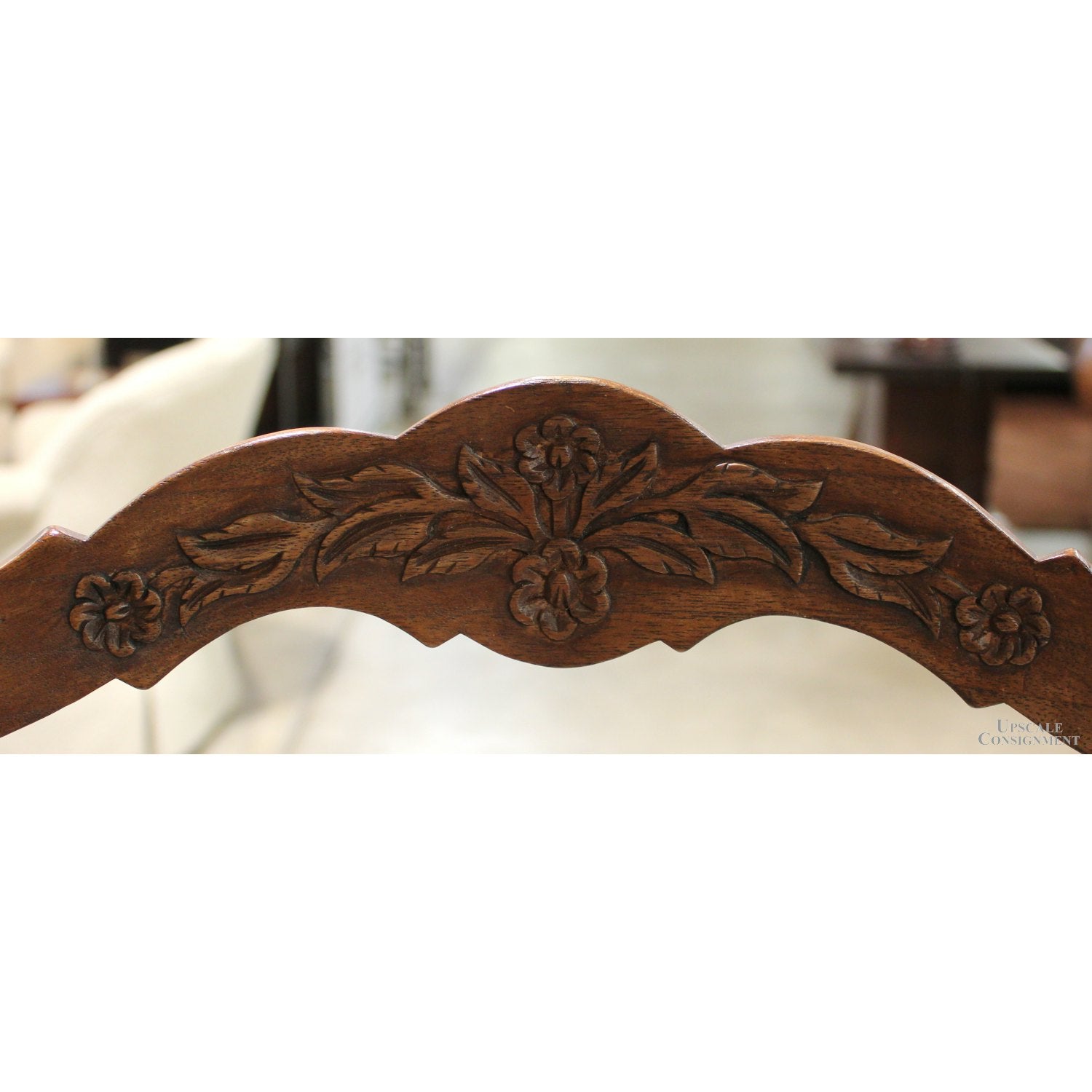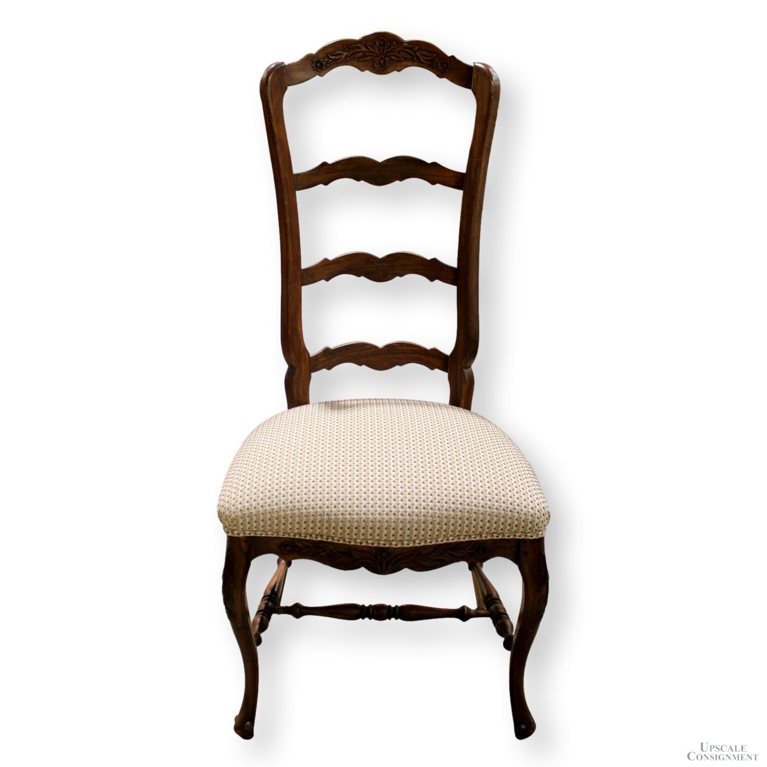 Features a dark finish wooden frame with carved floral accents, a high scalloped ladder back, and a beige seat with both striped & polka dotted designs.