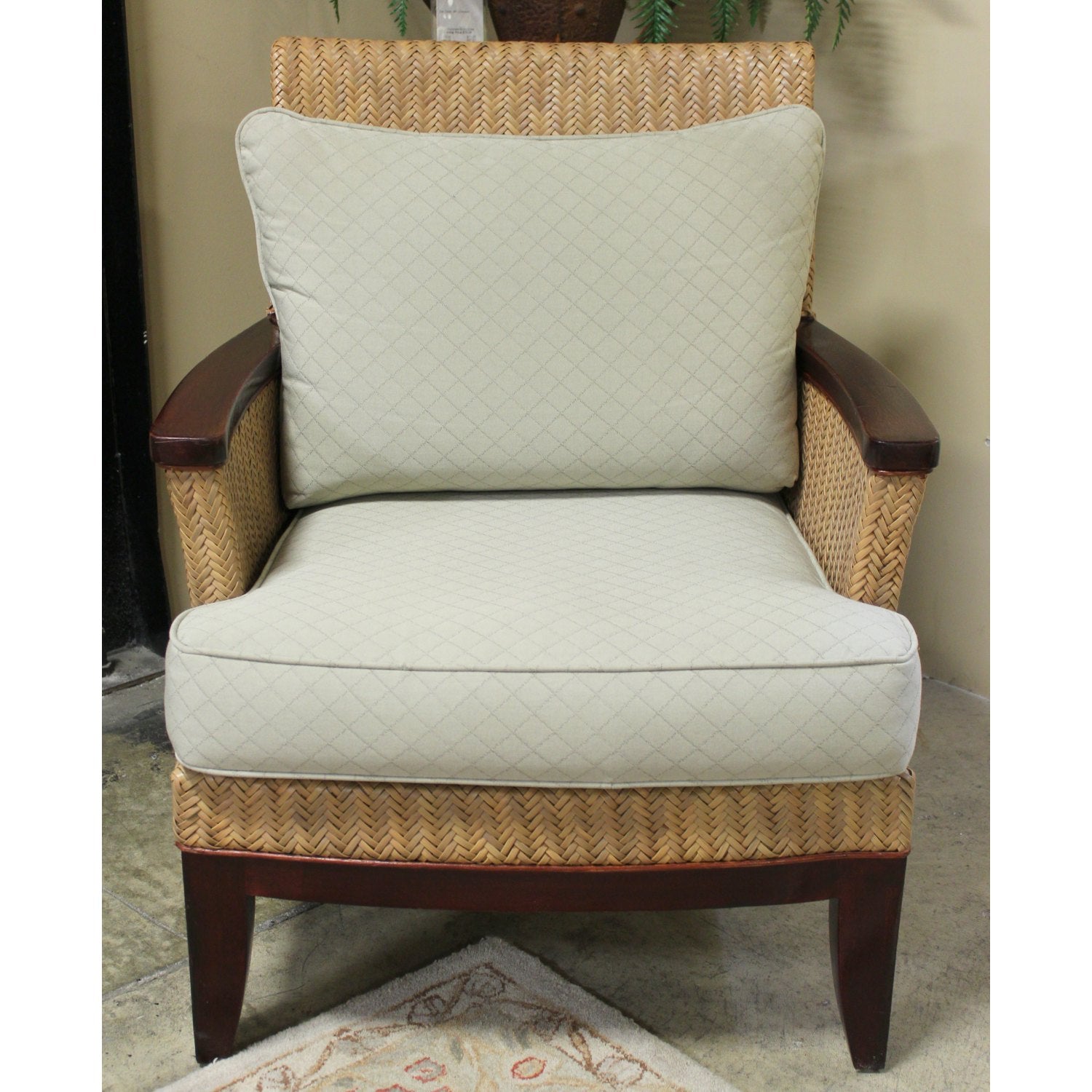 Woven rattan frame with dark wood accents defines this cushioned armchair and ottoman set. Upholstered in a light fabric with a subtle diamond pattern, both pieces feature short wooden legs and a relaxed silhouette. The ottoman measures 18'' high by 27'' wide and 19'' deep, offering a low, supportive surface that complements the chair’s proportions. The combination of natural texture and soft upholstery suits casual interiors with organic or coastal elements.