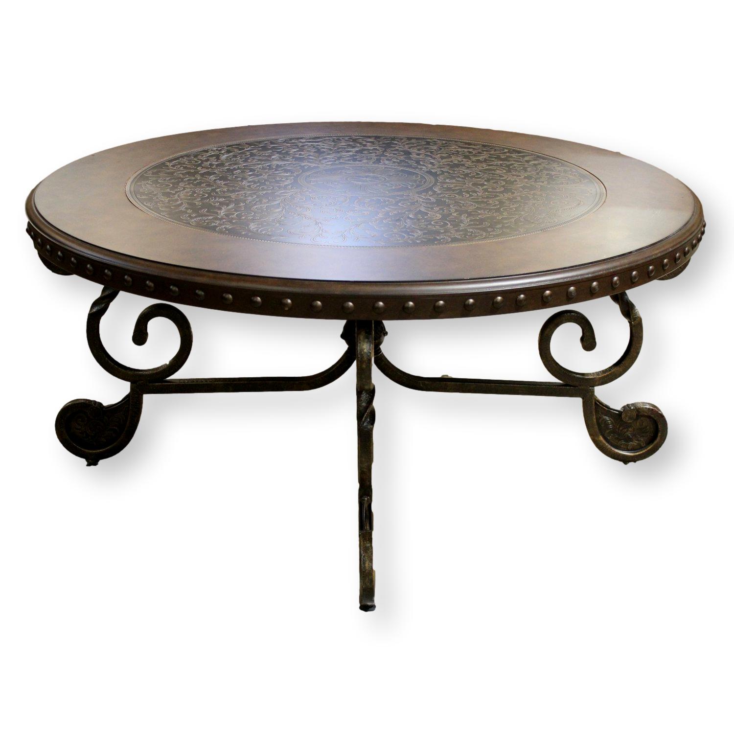 Round coffee table with an embossed metal top featuring ornate floral and scrollwork patterns. The mottled metal edge mimics the texture of aged leather, accented with evenly spaced nailhead trim. Supported by a 4-leg iron base with twisted uprights and curled feet.