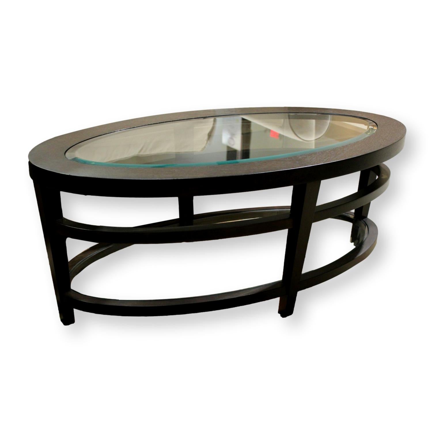 Oval glass insert-top coffee table with a dark wood frame featuring a beveled glass insert for full surface visibility. The base includes two parallel horizontal supports that create a layered architectural effect. Designed with clean lines and a low profile, it pairs well with contemporary or transitional interiors.