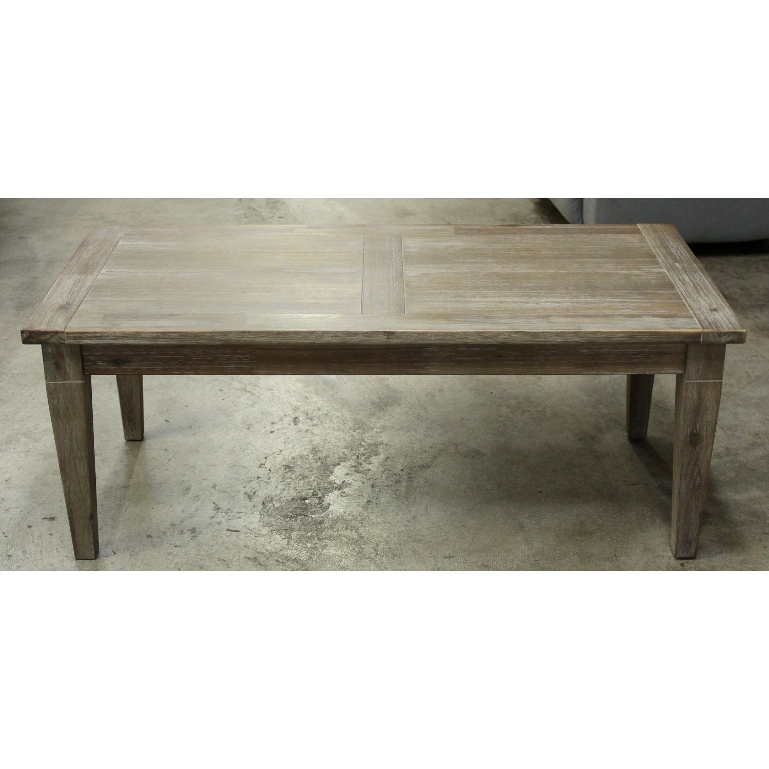 This piece features a rectangular top with a graywashed finish that highlights the wood grain and panel detailing. The clean profile is supported by four tapered legs that give it a light, balanced stance. Its straightforward form and muted tone suit a range of contemporary and casual settings.
