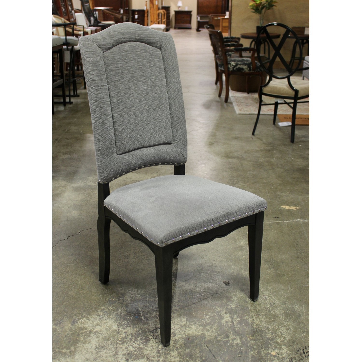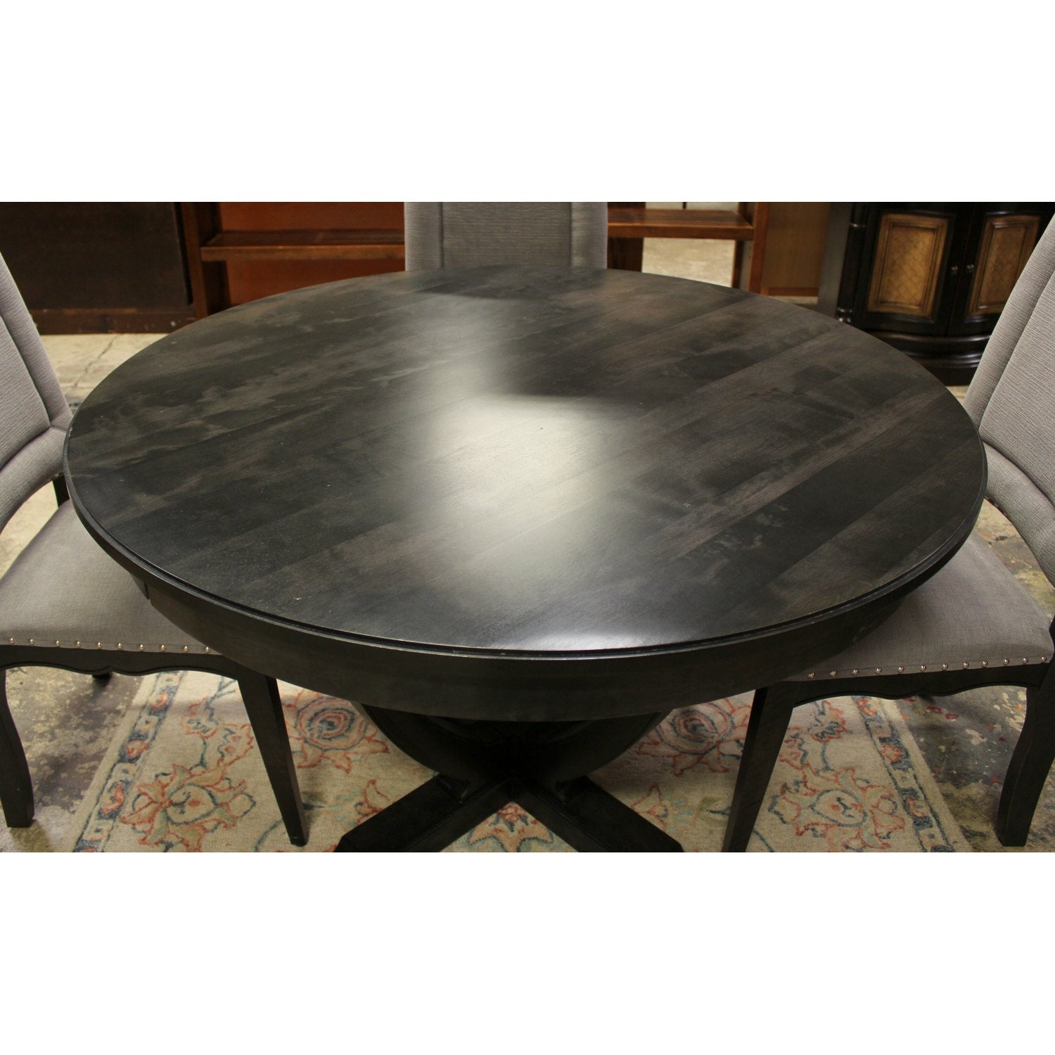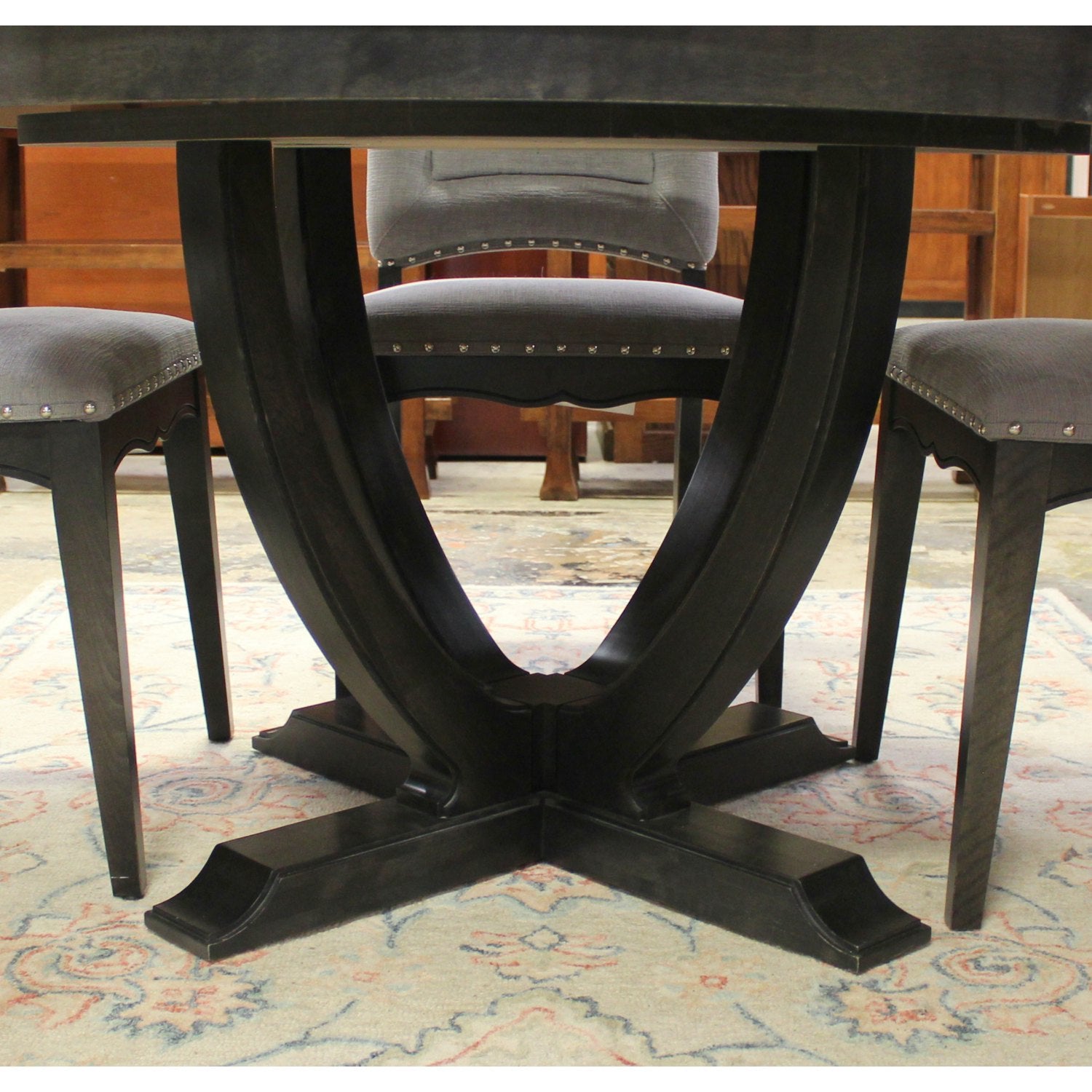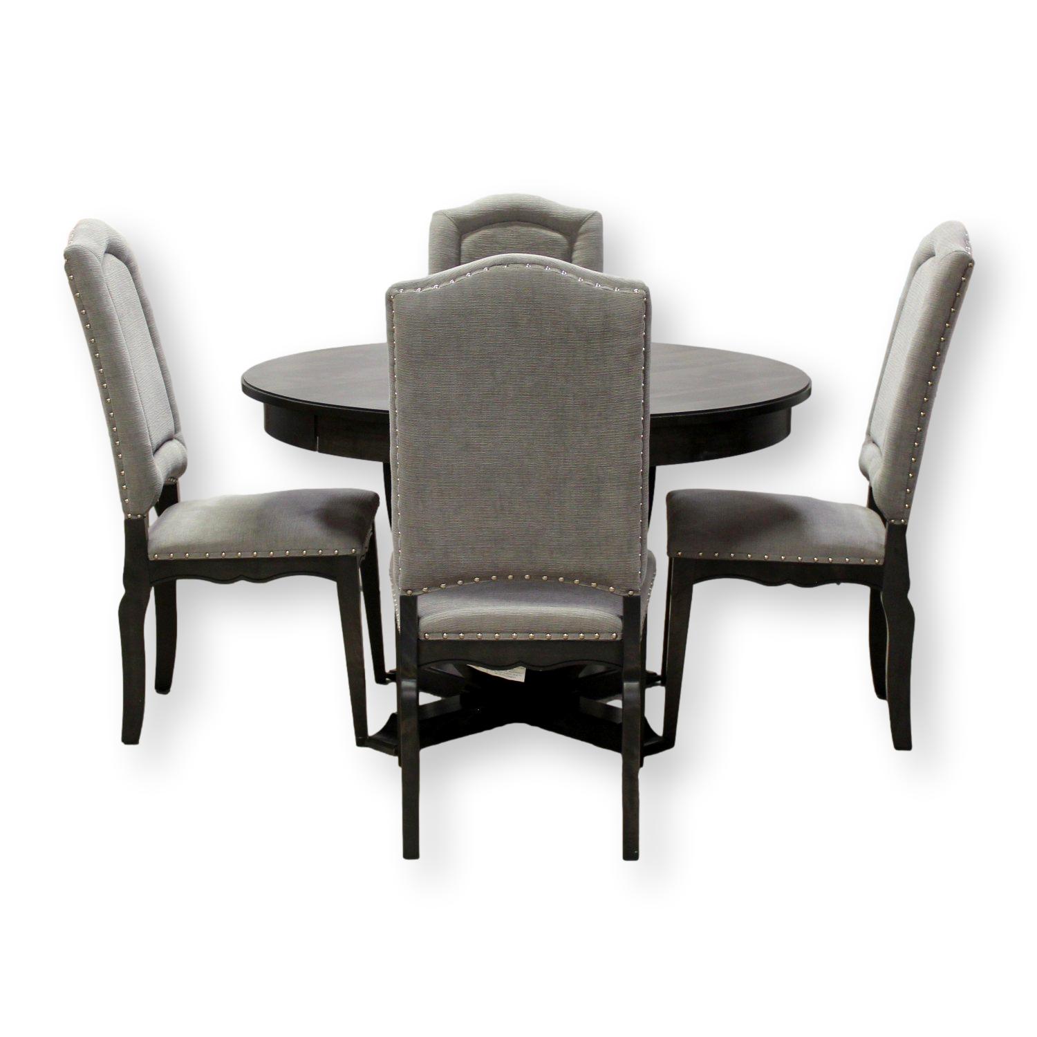 Round black pedestal table with curved supports, paired with four Canadel high-back upholstered chairs in light gray fabric featuring nailhead trim and dark wood legs.