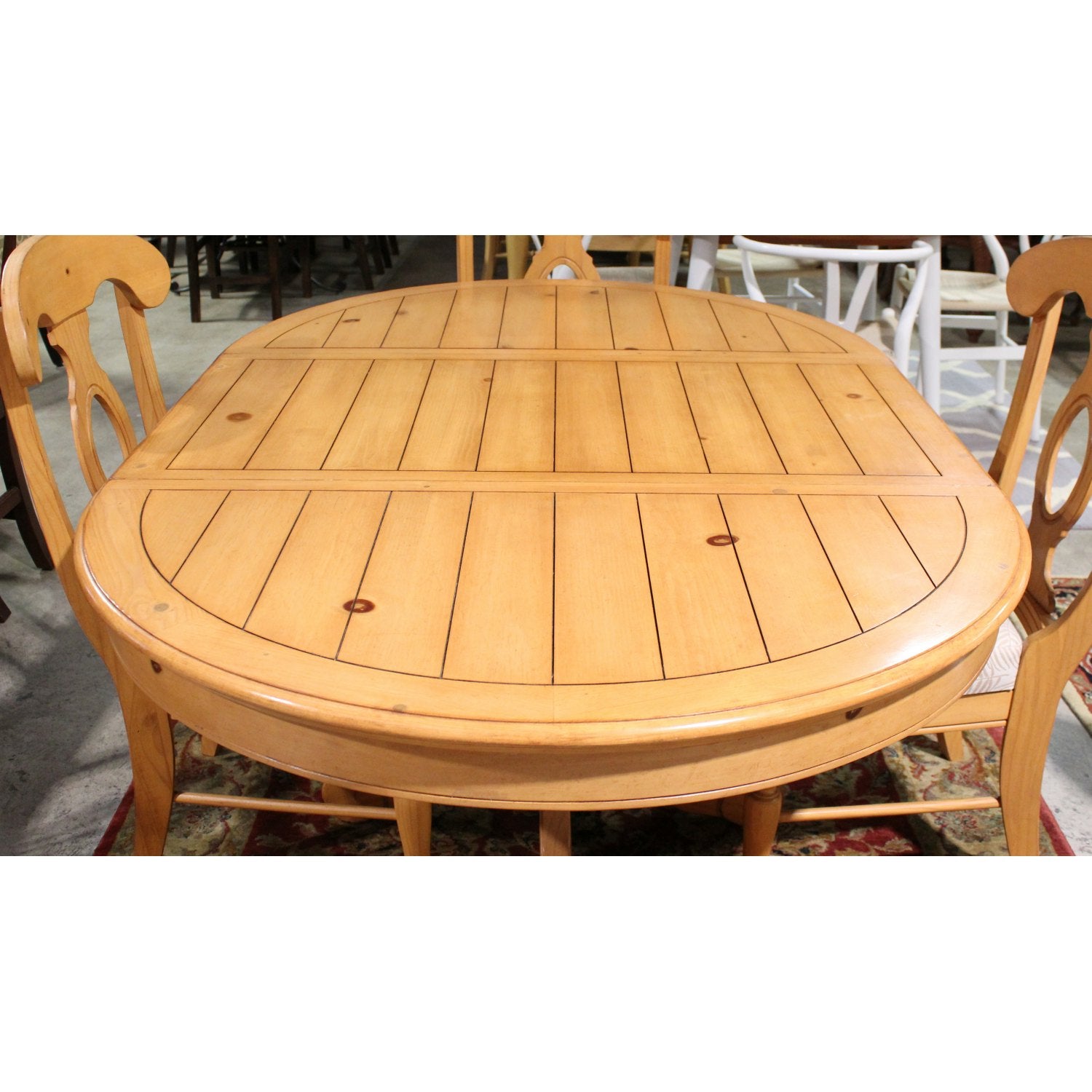 Traditional dining set in warm honey tone country pine with turned legs and an oval tabletop featuring a central 24" extension leaf. Includes four matching chairs with decorative backrests and upholstered seats in a beige and tan palm frond pattern.