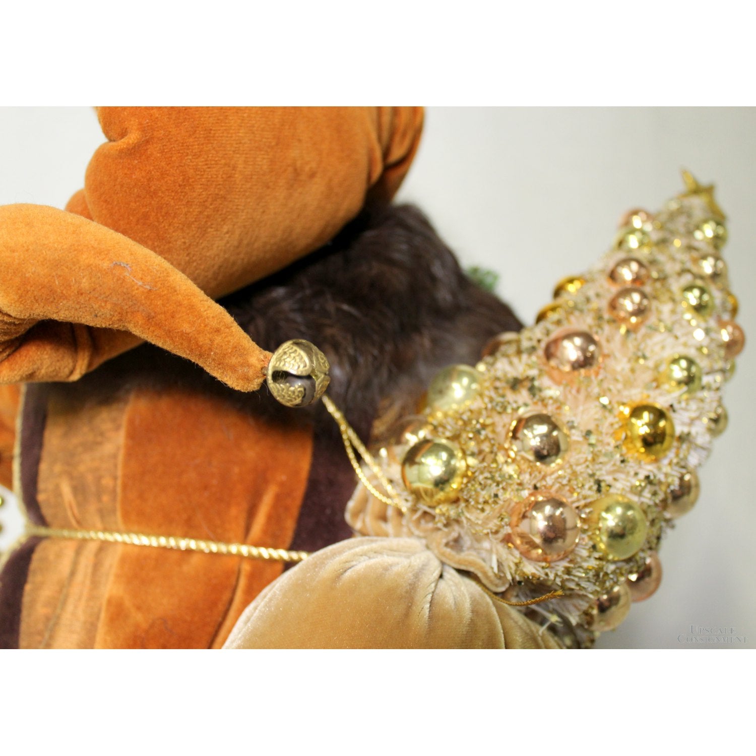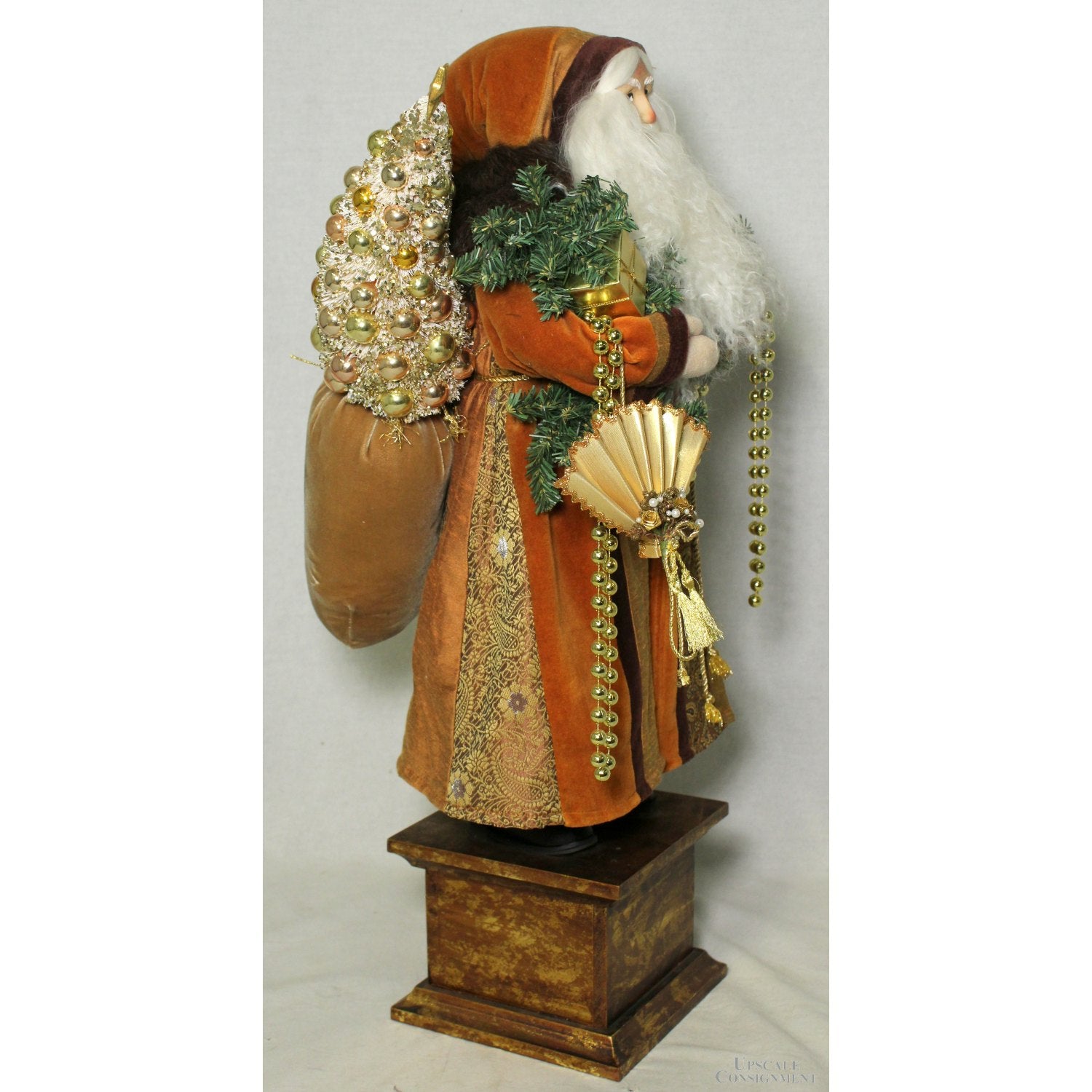Style #2816. Handcrafted 25" Santa figure dressed in layered velvet and brocade robes in warm copper & gold tones. Holds a decorated miniature tree, a wrapped gift, and a fan-shaped gold accent, with gold bead garlands draped across his arms. Mounted on a mottled bronze-tone pedestal base with ornate detailing.