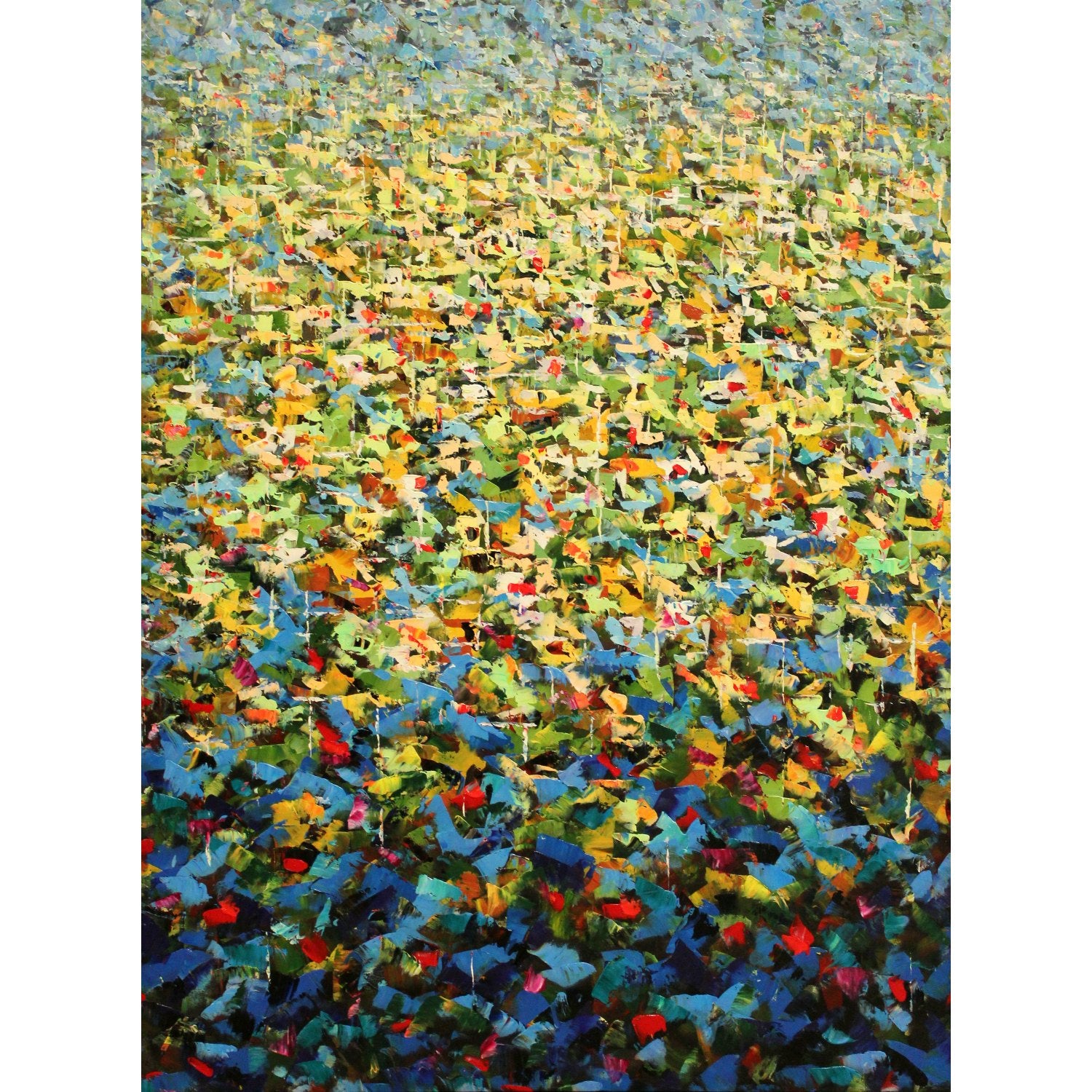 Features a gold tone floating frame, and hand painted original oil of a colorful abstract field of flowers in an ombre design.
