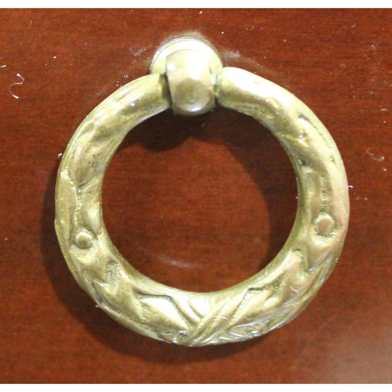 Traditional-style side table in warm-toned wood with a polished finish. Features two drawers with brass ring pulls and a lower open shelf framed by turned legs. Legs taper slightly and are capped with brass ferrules. Compact proportions and classic detailing suit vintage or transitional interiors. Suitable for use as a side table or nightstand.