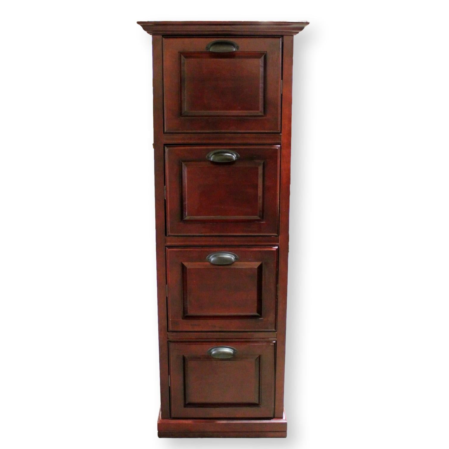 Vertical four-drawer cabinet in a dark cherry finish with an untextured surface and classic panel detailing. Each drawer opens on metal slides and features a centered pewter-tone pull. Designed without locks or keys, the piece offers straightforward access for document storage.