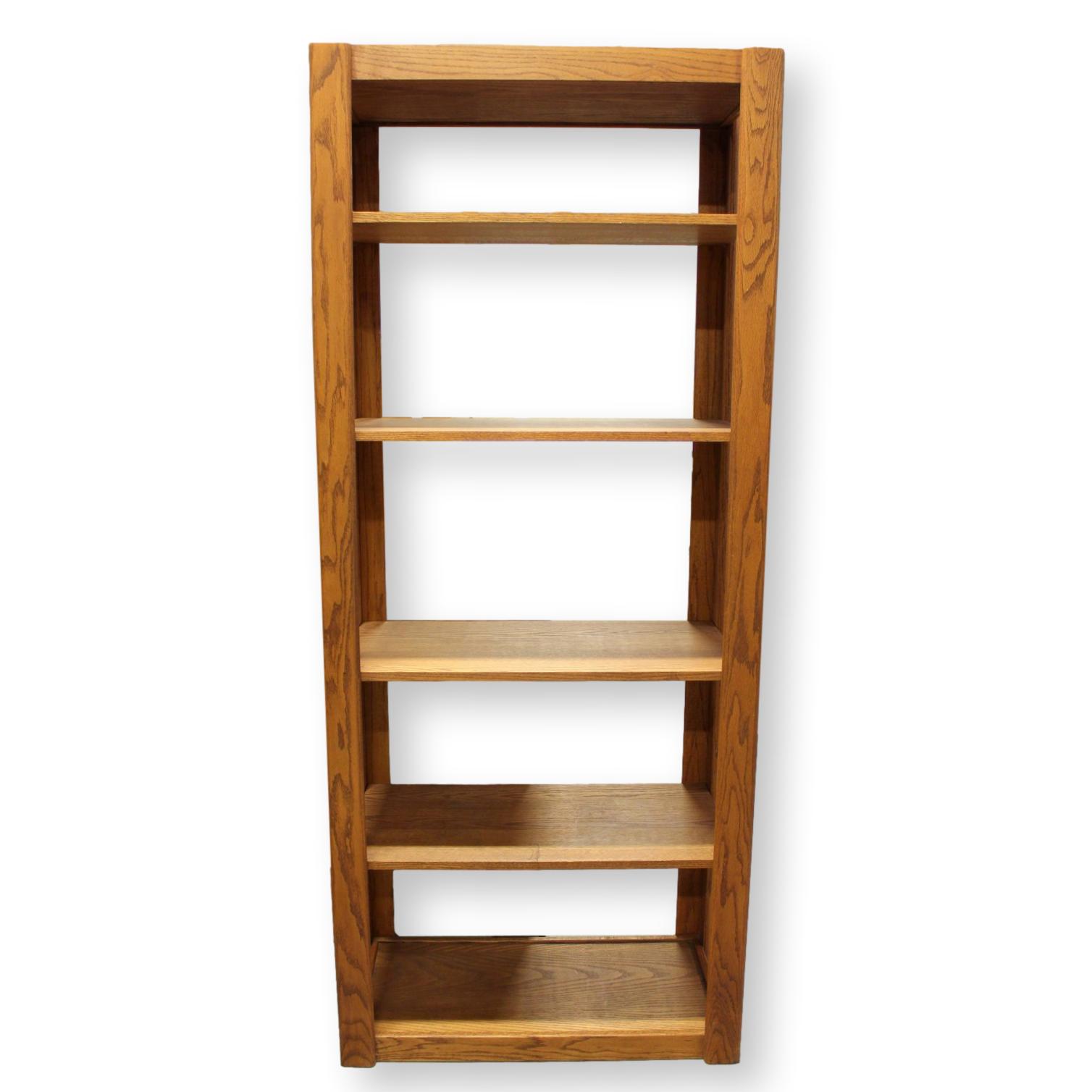 This piece features a straight-edged oak frame with a warm, even grain and an open, vertical profile. Four wooden shelves sit on adjustable supports, allowing flexible spacing for storage or display. The sides and back remain open, giving the structure a light, airy appearance consistent with the etagere form.