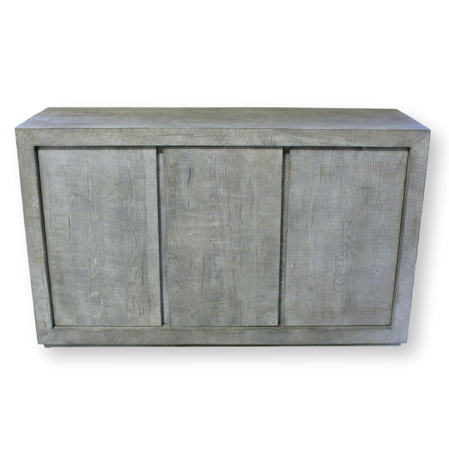 This piece features a clean, modern profile with three vertically paneled doors that highlight the linear grain of the wood. The rustic reclaimed oak finish softens the geometric form, giving it a balanced mix of contemporary and rustic character. Its broad, uninterrupted front keeps the look minimal while emphasizing the natural texture visible in the surface.