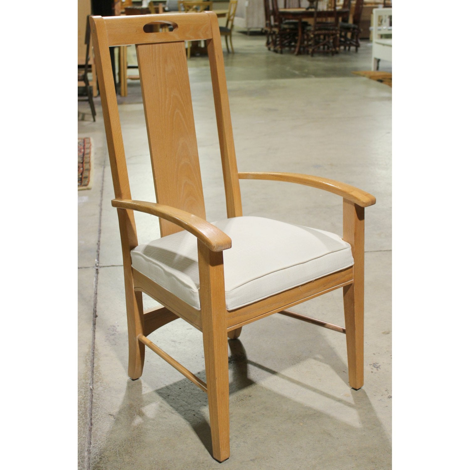 Rectangular dining table with a smooth, light oak finish and squared legs for a clean, contemporary profile. The six matching chairs feature high backs with rectangular cut-outs and padded seats upholstered in neutral fabric. Uniform wood tone and simple lines lend a cohesive, modern look suited to casual or formal settings.