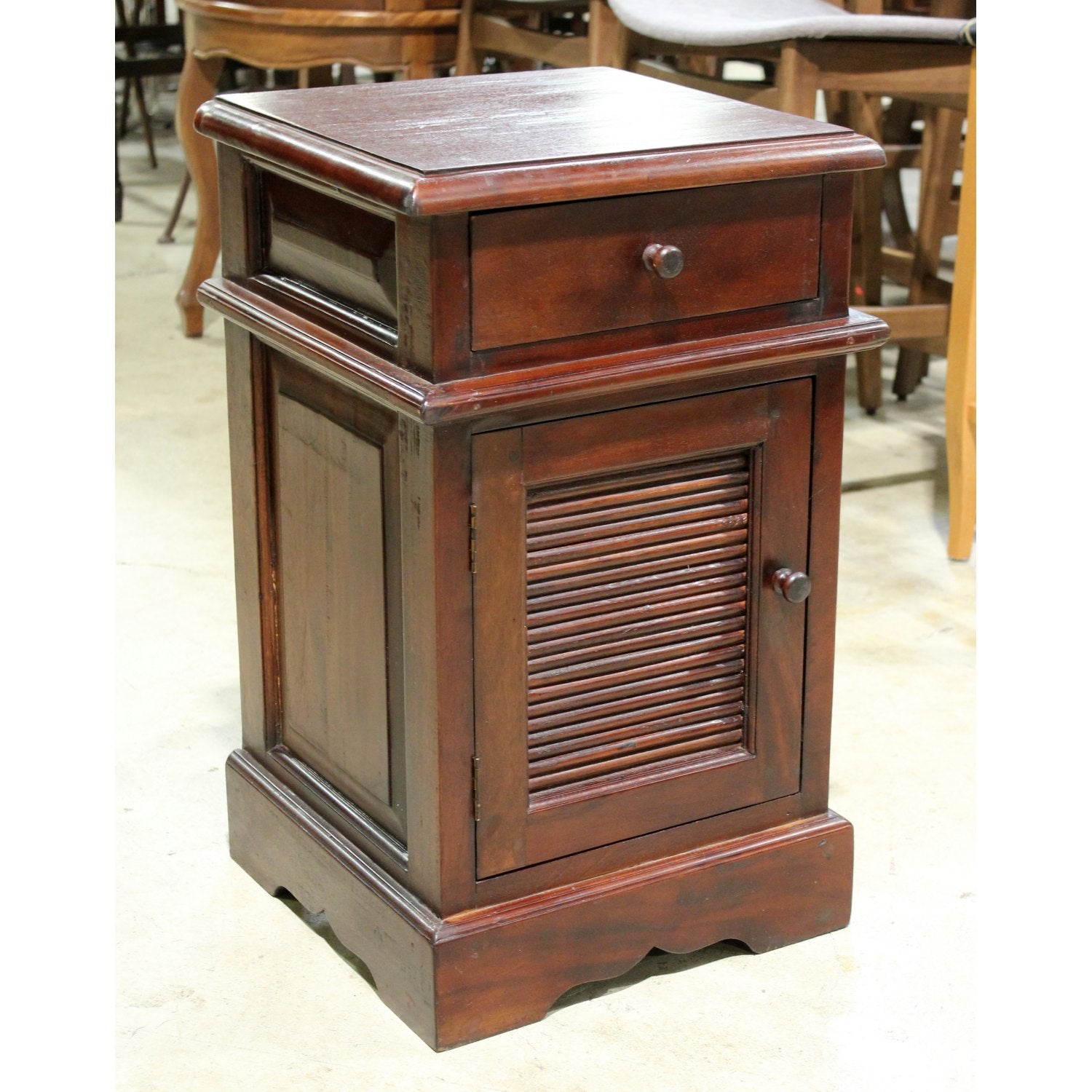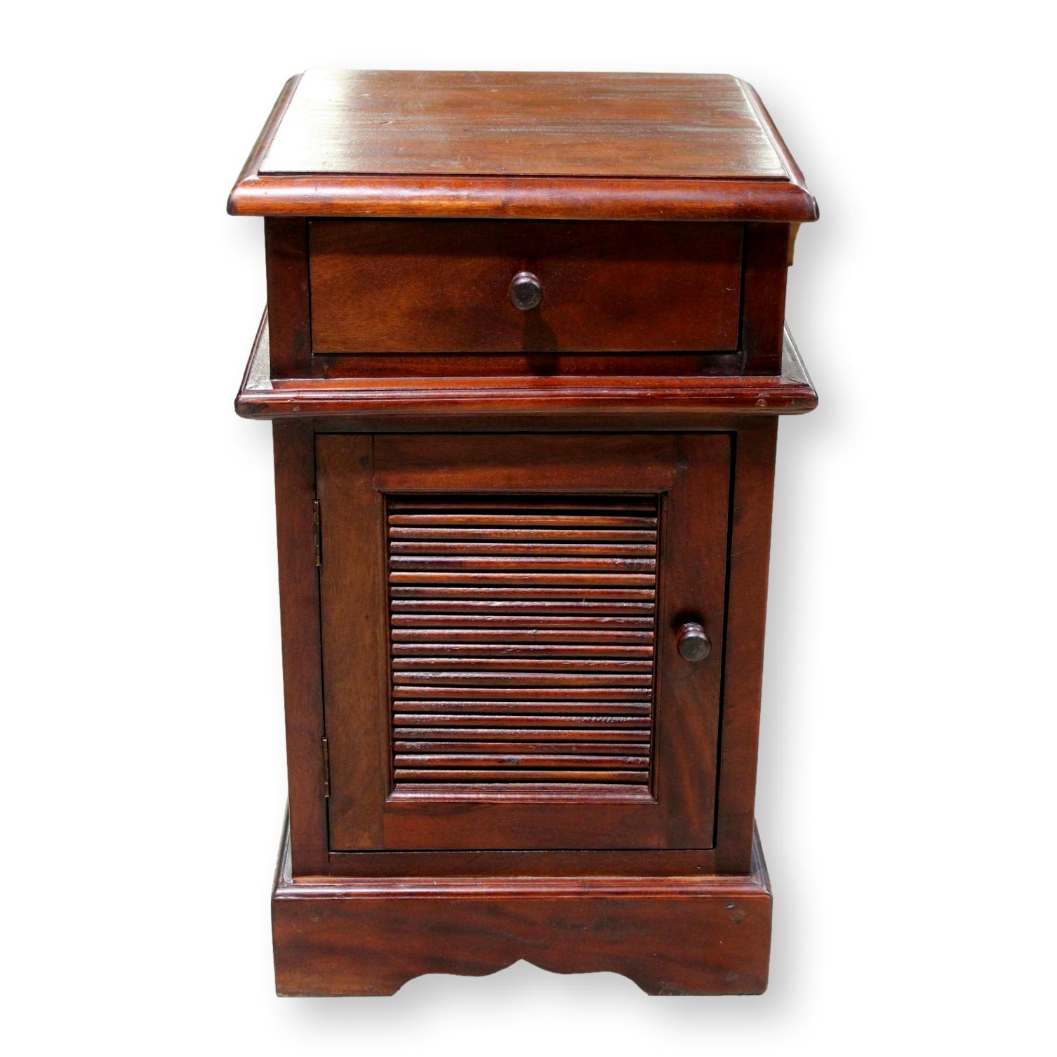 Compact and traditional in form, this dark-stained wood piece features a single drawer with a round knob and a lower cabinet door with horizontal reeded slats. The scalloped base and rounded hardware add subtle decorative detail. Suitable for bedside or accent use, it offers enclosed storage in a small footprint.