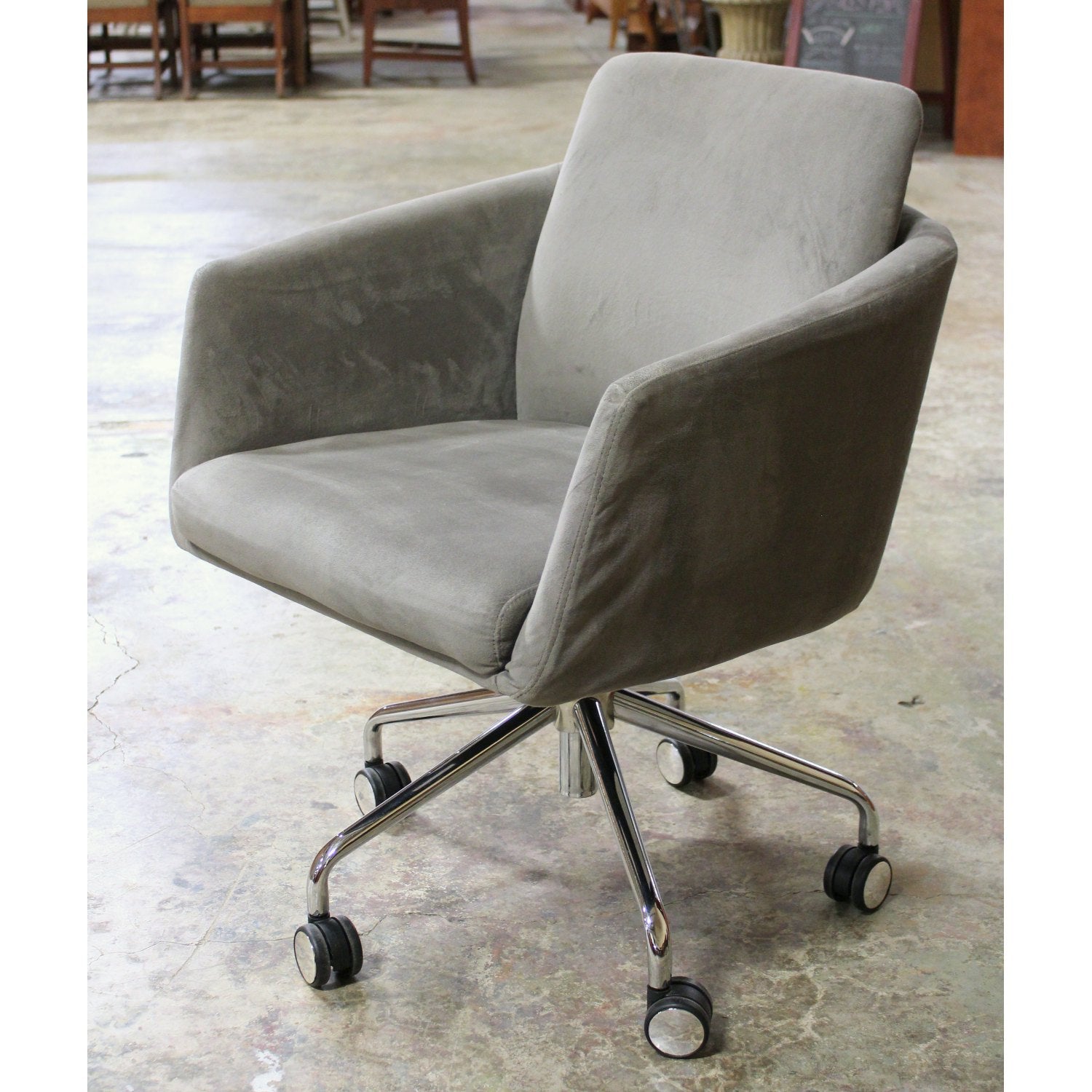 Modern task chair with gray microfiber upholstery and a cushioned seat and backrest for comfort. Integrated armrests and a chrome five-star base with dual-wheel casters offer support and mobility. The seat height adjusts from 19 to 23 inches to suit various desk setups. Clean lines and neutral tones make it suitable for both home and office environments.