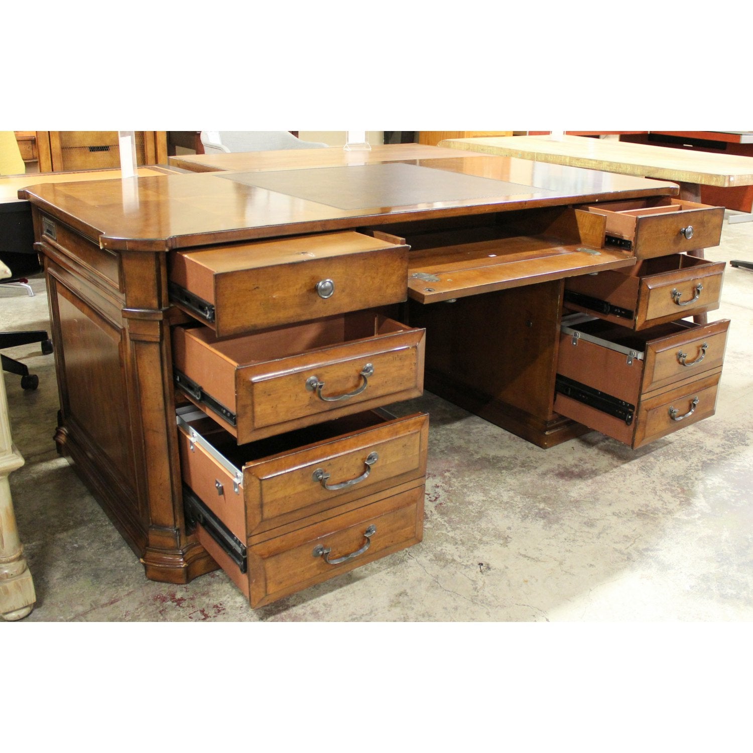Traditional executive desk in a rich brown finish with carved corner details and a paneled front. Features seven drawers including two file drawers and a central keyboard tray, all with antique-style hardware. A brush grommet on the side panel allows for discreet cable management. A finished back. The desk separates into four sections for easier transport.