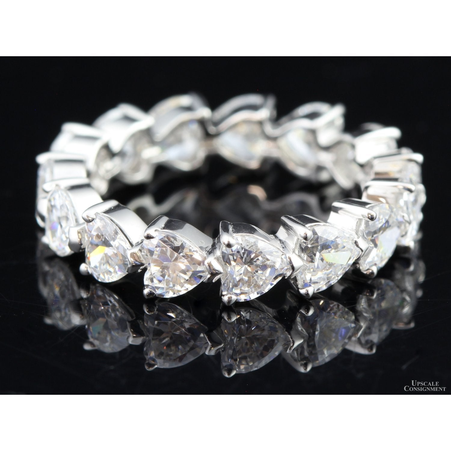 This 14 karat white gold eternity ring by Absolute features a bright polish finish and is set with fifteen 4.0 x 4.0mm heart-shaped cubic zirconia stones weighing 7.05 ctw. The ring measures 4.5mm in width and the condition is excellent. #90 #A.