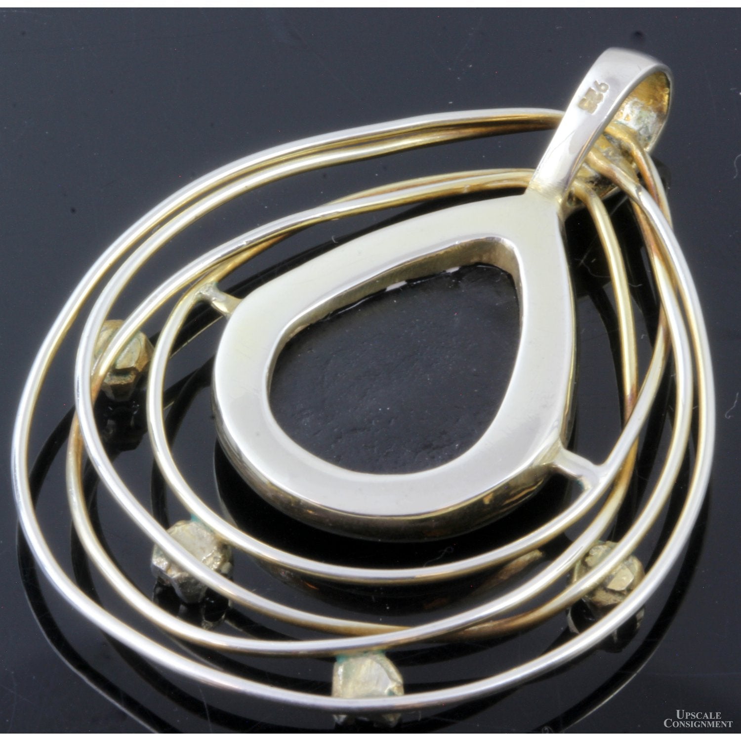 This teardrop-shaped pendant features a sterling silver free-form wire solaris-style design and is bezel-set with a pear-shaped ammolite triplet assembled stone measuring 20mm x 27mm x 10mm (d). Also set in the wire pendant are four 3.50mm round white sapphire gemstones. The teardrop pendant and bail measure 2.06" (l) x 0.625" (w) and have been rhodium-plated, offering a bright white finish.