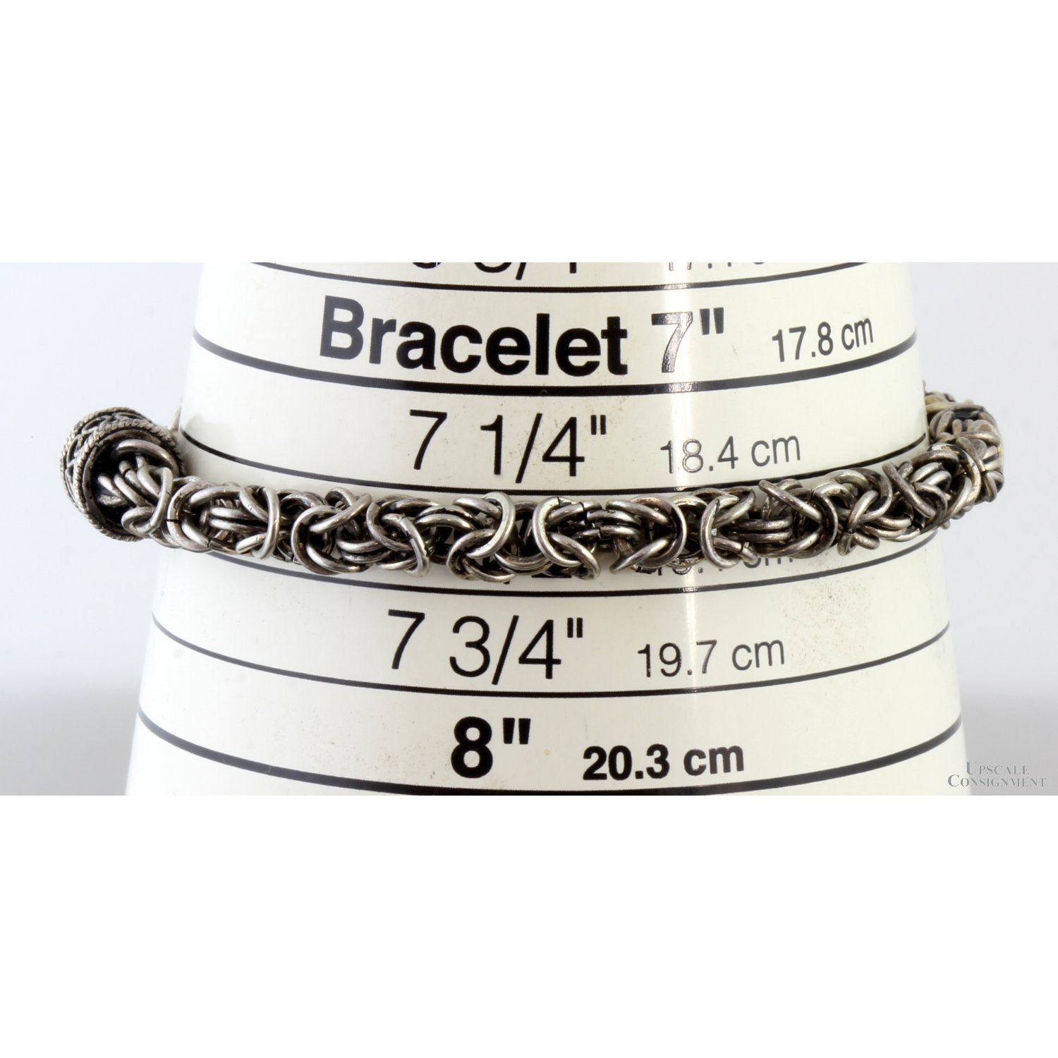 This matching pair of Byzantine-style bracelets features classic interwoven links accented with decorative 10mm barrel beads with scrolled designs, adding visual rhythm along the length of each bracelet. Each bracelet measures approximately 8 inches in length, 6mm in width and is finished with a lobster clasp.